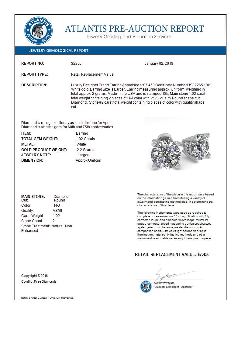 REF-150W9F -32265 ---- 1.02 CTW VS/SI Diamond Stud Designer Earrings 18K White Gold ---- Luxury Designer Brand Earring Appraised at $7,450 Certificate Number US32265 18k White gold, Earring Size is Larger, Earring measuring approx. Uniform, weighing in total approx. 2 grams. Made in the USA and is stamped 18k, Main stone 1.02 carat total weight containing 2 pieces of H-J color with VS/SI quality Round shape cut Diamond , Stone #2 carat total weight containing pieces of color with quality shape cut