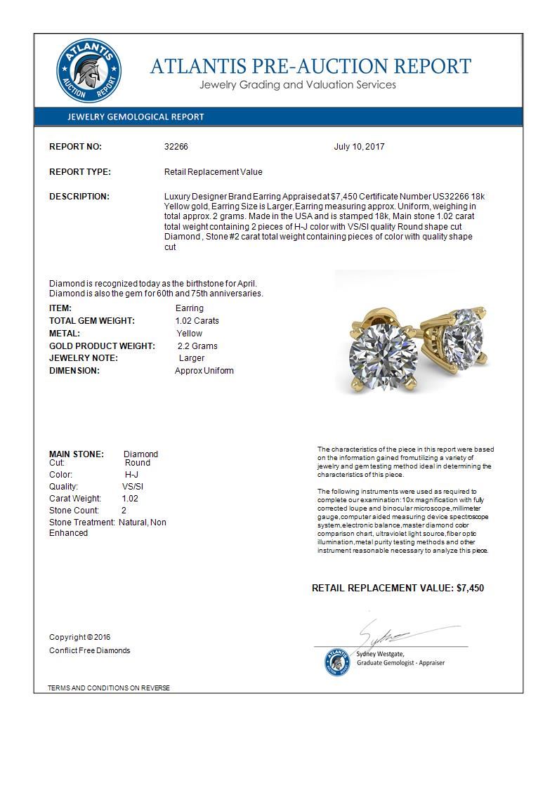 1.02 CTW VS/SI Diamond Stud Designer Earrings 18K Yellow Gold ---- Luxury Designer Brand Earring Appraised Retail Price at $7,450 ---- SKU Number US32266 18k Yellow gold Earring Size is Larger, Earring measuring approx. Uniform, weighing in total approx. 2 grams. Made in the USA and is stamped 18k, Main stone 1.02 carat total weight containing 2 pieces of H-J color with VS/SI quality Round shape cut Diamond , Stone #2 carat total weight containing pieces of color with quality shape cut