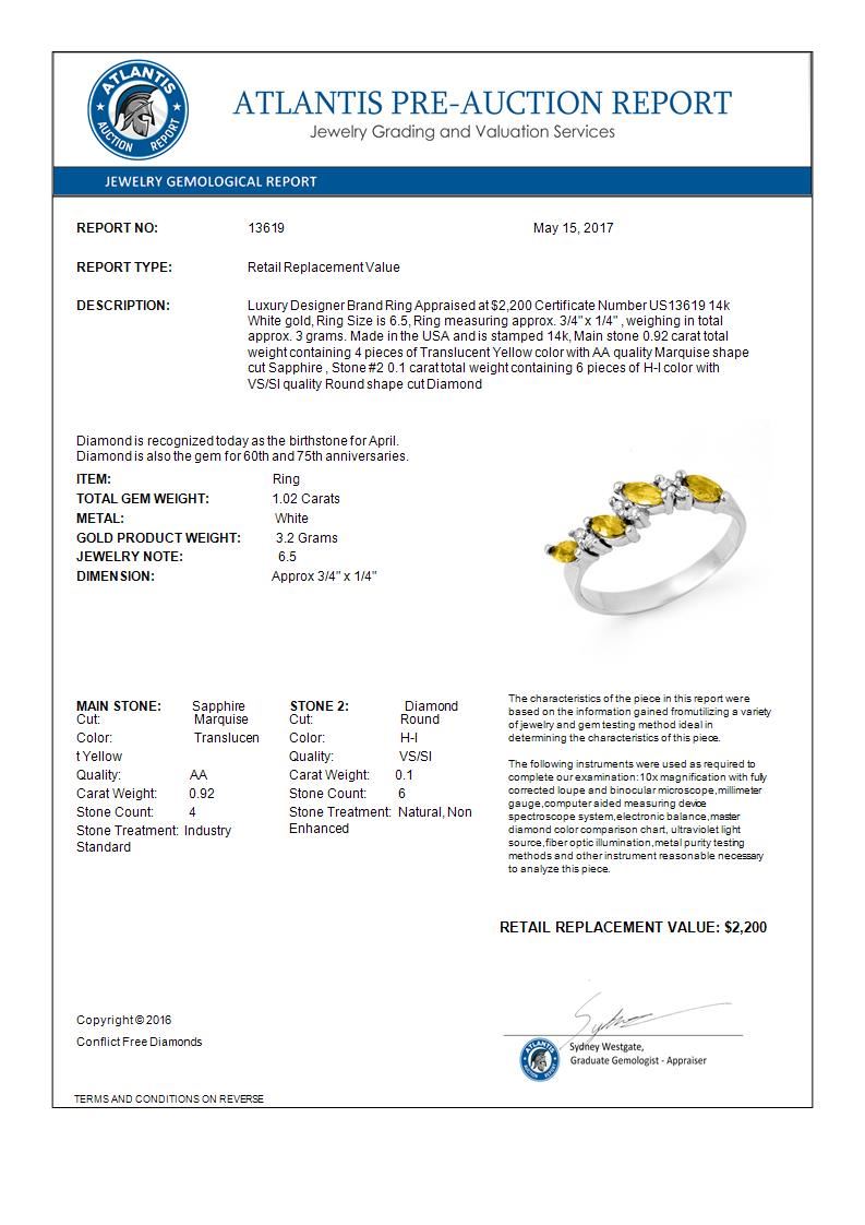 1.02 CTW Yellow Sapphire & Diamond Ring 14K White Gold ---- Luxury Designer Brand Ring Appraised Retail Price at $2,200 ---- SKU Number US13619 14k White gold Ring Size is 6.5, Ring measuring approx. 3/4" x 1/4" , weighing in total approx. 3 grams. Made in the USA and is stamped 14k, Main stone 0.92 carat total weight containing 4 pieces of Translucent Yellow color with AA quality Marquise shape cut Sapphire , Stone #2 0.1 carat total weight containing 6 pieces of H-I color with VS/SI quality Round shape cut