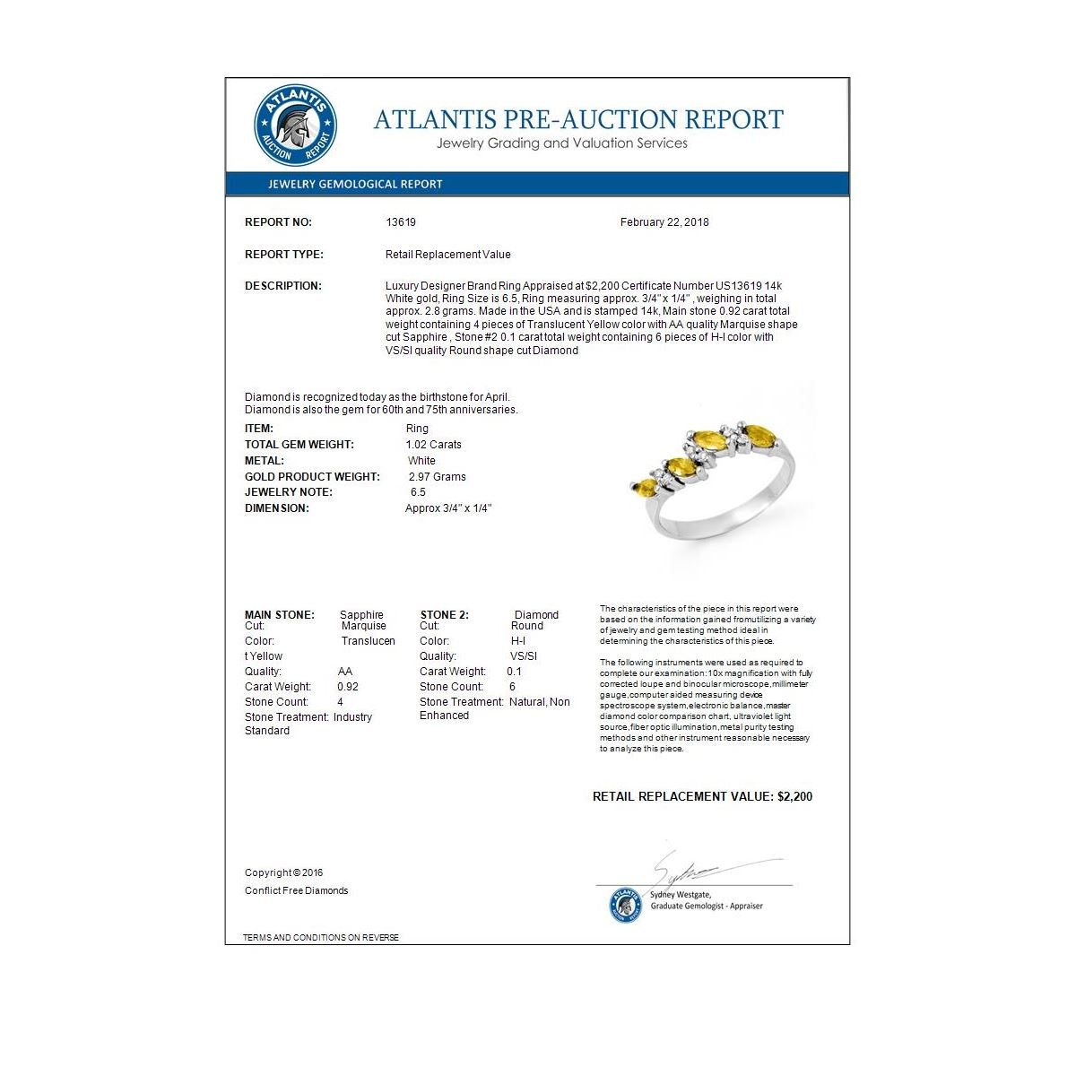 REF-30W9F -13619 ---- 1.02 CTW Yellow Sapphire & Diamond Ring 14K White Gold ---- Luxury Designer Brand Ring Appraised at $2,200 Certificate Number US13619 14k White gold, Ring Size is 6.5, Ring measuring approx. 3/4" x 1/4" , weighing in total approx. 2.8 grams. Made in the USA and is stamped 14k, Main stone 0.92 carat total weight containing 4 pieces of Translucent Yellow color with AA quality Marquise shape cut Sapphire , Stone #2 0.1 carat total weight containing 6 pieces of H-I color with VS/SI quality Round shape cut Diamond