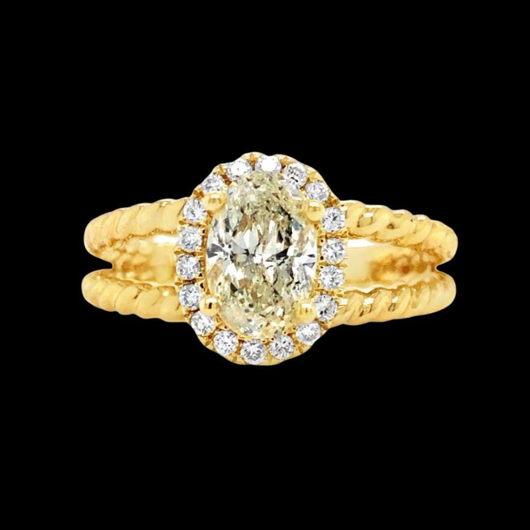 TITLE DESCRIPTION: 18k 1.02ct Diamond Unity Ring Rope Design DESCRIPTION DETAIL: A stunning ring featuring an oval shaped natural Diamond surrounded by a halo of natural round brilliant cut Diamonds. The unique split shank is crafted in a 18K Yellow Gold rope design. OVERALL CONDITION: Excellent, New CENTER DIAMOND: Natural Weight: 1.02 Carats Total Weight Shape: Oval, Faceted Clarity: I1 Color: I ADJACENT DIAMONDS: Natural (18) Weight: 0.17 Carats Total Weight Shape: Round, Faceted Clarity: SI2 - I1 Color: F- H METAL: 18k Yellow Gold WEIGHT: 5.30 grams SIZE: 6.25 US SOURCE: Corporate liquidation The consignor's stated retail value is $12,000.00. and retail & Gemological report from AIG labs is included. PRIOR TO BIDDING READ THE DESCRIPTION & TERMS CAREFULLY This description and condition report is provided for your convenience based on the information provided by the consignor. CAA is not responsible for any discrepancies between this information and other opinions. Buyers Premium: 18% Shipping Billed Separately Payment Due in 7 days All items shipped to registered address - NO EXCEPTIONS