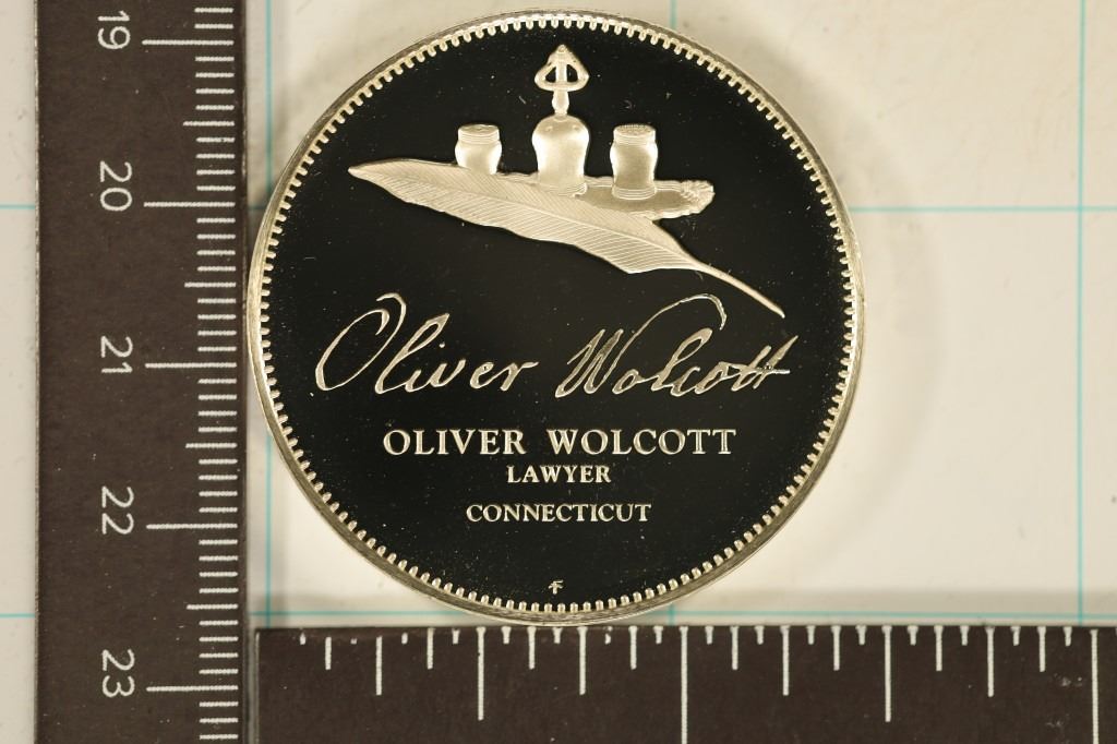 OFFICIAL MEDAL OF THE BICENTENNIAL COUNCIL OF THE 13 ORIGINAL STATES, PART OF THE DECLARATION SIGNERS SERIES "OLIVER WOLCOTT" LAWYER, CONNECTICUT. IN HARD PLASTIC CAPSULE