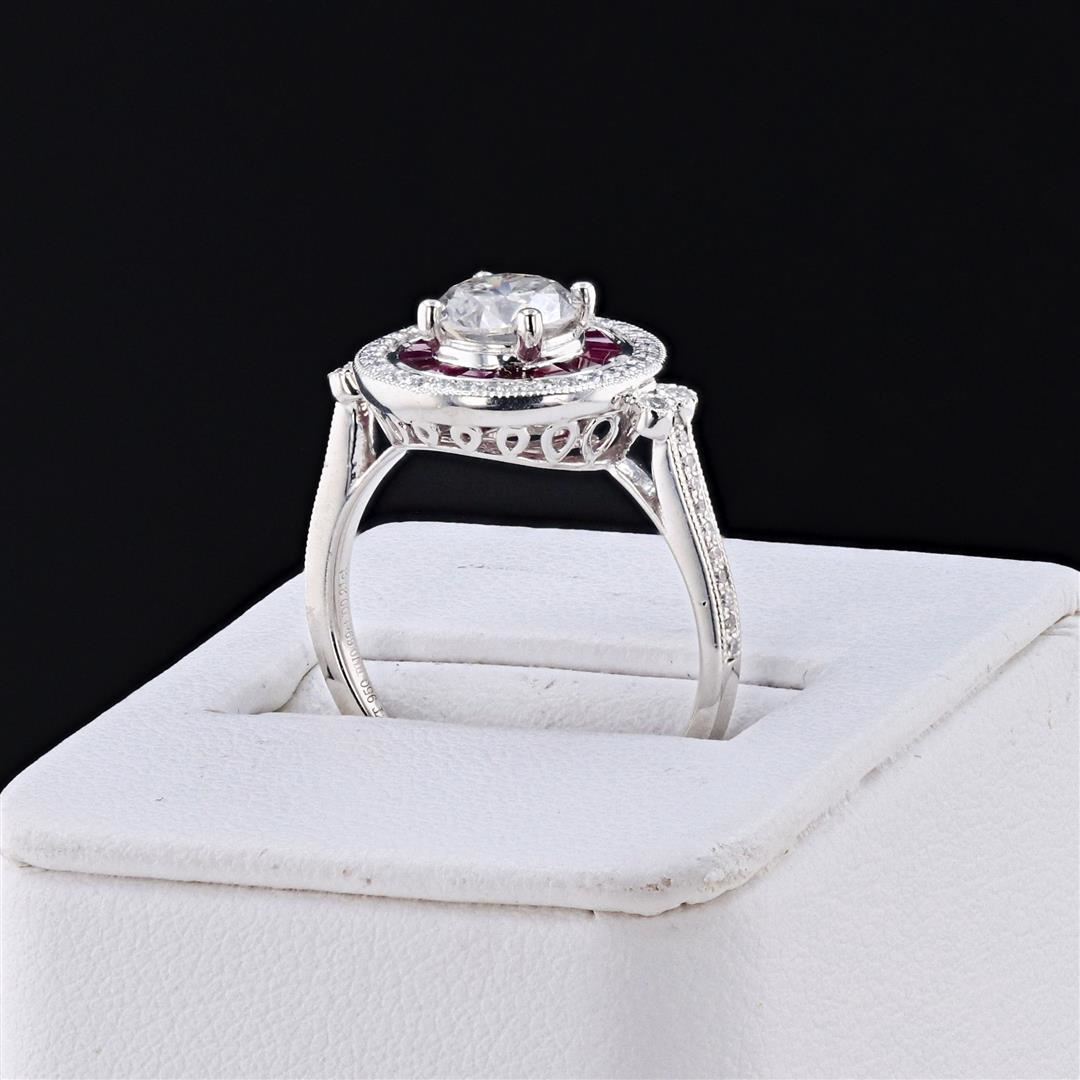 1.02ct CENTER Diamond and 0.69ctw Ruby Platinum Ring (1.23ctw Diamonds). Name of Article: Lady's Ruby and Diamond Ring Setting: Platinum Mounting [5.90 gms] Cut: Round Brilliant Color: J - K Clarity: I1 Measurements: 6.40 x 6.36 x 3.96mm Approximate Weight: 1.02 Carats Additional Stones/Information: 58 Round Brilliant Diamonds = Approx. 0.21 Cts. TWT (Color: G-H, Clarity: SI-I2) and 16 Tapered Step Cut Rubies = Approx. 0.69 Cts. TW (Color: Red Saturation: Moderately Strong Transparency: Semitransparent)