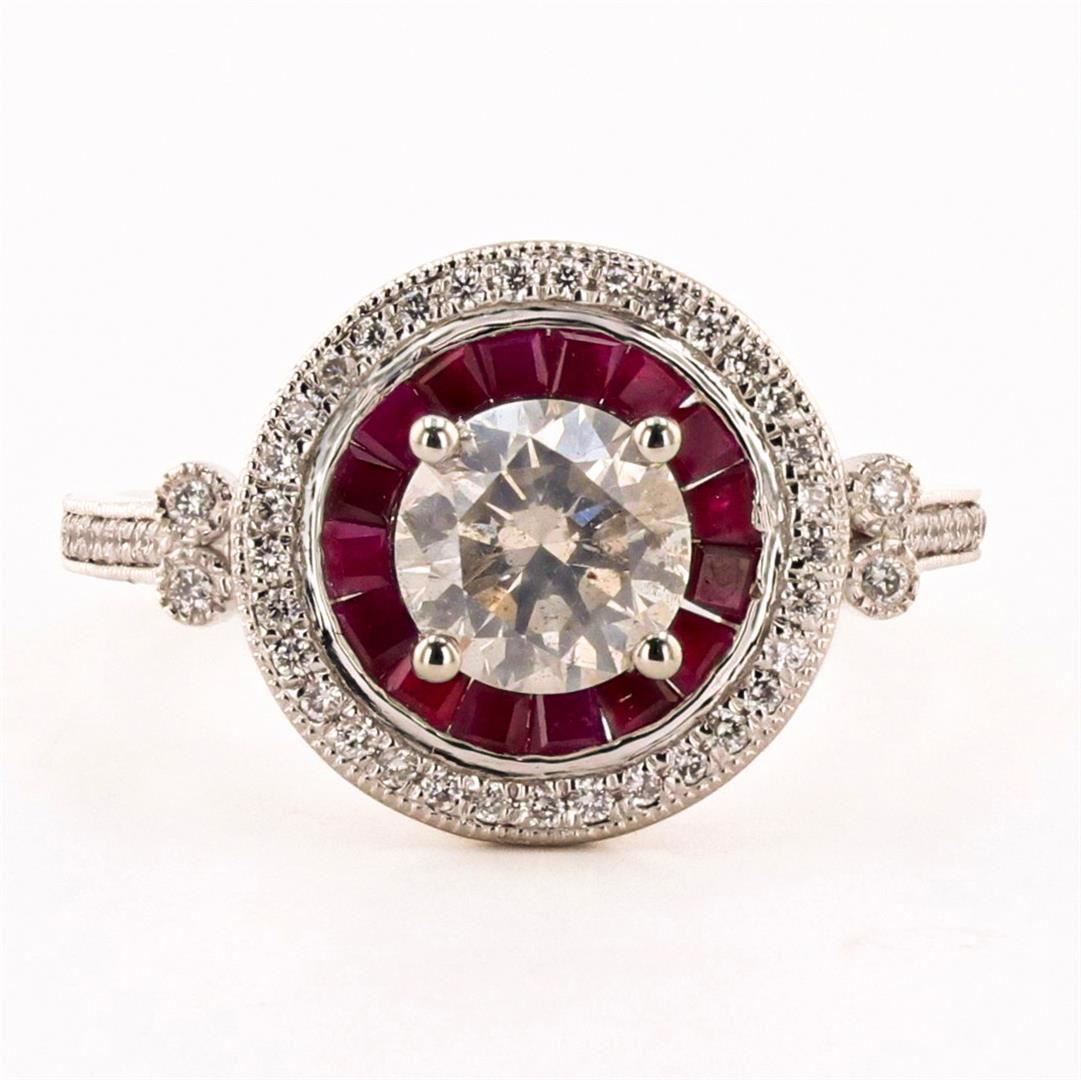 1.02ct CENTER Diamond and 0.69ctw Ruby Platinum Ring (1.23ctw Diamonds). Name of Article: Lady's Ruby and Diamond Ring Setting: Platinum Mounting [5.90 gms] Cut: Round Brilliant Color: J - K Clarity: I1 Measurements: 6.40 x 6.36 x 3.96mm Approximate Weight: 1.02 Carats Additional Stones/Information: 58 Round Brilliant Diamonds = Approx. 0.21 Cts. TWT (Color: G-H, Clarity: SI-I2) and 16 Tapered Step Cut Rubies = Approx. 0.69 Cts. TW (Color: Red Saturation: Moderately Strong Transparency: Semitransparent)