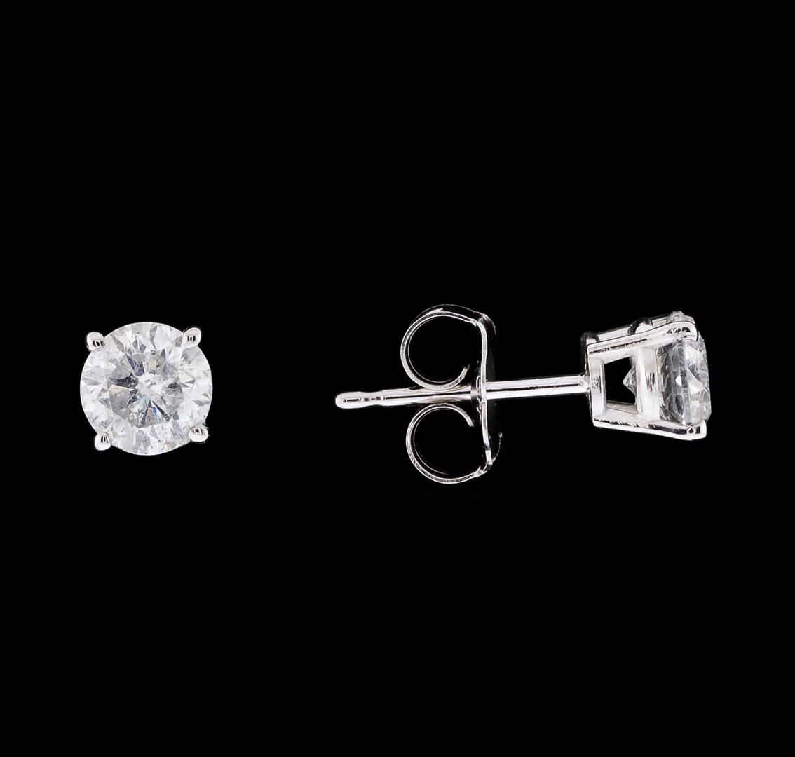 One pair electronically tested 14KT white gold lady's cast stud earrings with friction posts with a basket setting with a bright polish finish. Identified with markings of '14K'. Condition is new, good workmanship. Containing: One prong set round brilliant cut diamond, measuring 5.05 - 5.00 x 3.30mm (depth est.) approximate weight of 0.52ct. Graded in the setting. Clarity I-1. Color: G - H Cut Very Good One prong set round brilliant cut diamond, measuring 4.92 - 4.89 x 3.40mm (depth est.) approximate weight of 0.50ct. Graded in the setting. Clarity I-2. Color: G Cut Good. Total Weight of Diamonds 1.02ct.. Total Weight of Earrings 1.00gm. GAS Appraised at $4,710.00.