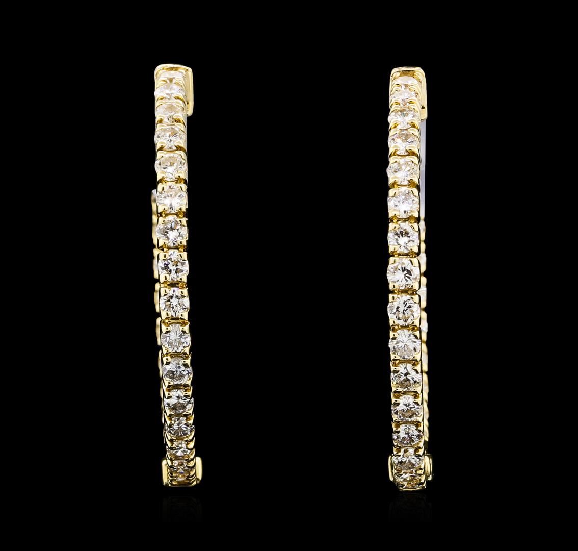 One pair electronically tested 14KT yellow gold lady's combination cast & assembled inside out hoop earrings with hinged clip backs with a bright polish finish. The featured earrings have a diameter of approximately twenty-five millimeters. Identified with markings of '14K'. Condition is new, good workmanship. Containing: Fifty prong set round brilliant cut diamonds, measuring 1.80 - 1.70 x 1.09mm (depth est.) approximate total weight of 50 Stones = 1.02ct. Graded in the setting. Color H - I Clarity VS-2 to SI-1 Cut Good. Total Weight of Diamonds 1.02ct.. Total Weight of Earrings 4.30gm GAS Appraised at $3340.00. GAS Appraised at $3,340.00.