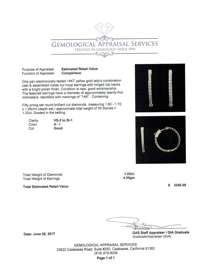 One pair electronically tested 14KT yellow gold lady's combination cast & assembled inside out hoop earrings with hinged clip backs with a bright polish finish. The featured earrings have a diameter of approximately twenty-five millimeters. Identified with markings of '14K'. Condition is new, good workmanship. Containing: Fifty prong set round brilliant cut diamonds, measuring 1.80 - 1.70 x 1.09mm (depth est.) approximate total weight of 50 Stones = 1.02ct. Graded in the setting. Color H - I Clarity VS-2 to SI-1 Cut Good. Total Weight of Diamonds 1.02ct.. Total Weight of Earrings 4.30gm GAS Appraised at $3340.00. GAS Appraised at $3,340.00.