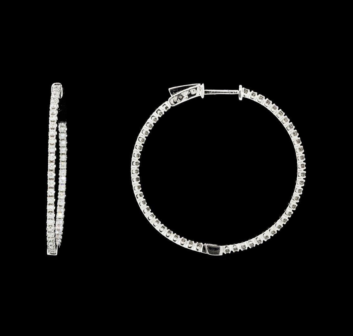 One pair electronically tested 18KT white gold lady's combination cast & assembled inside out hoop earrings with hinged, snap locking posts with a bright polish finish. Identified with markings of '18K'. Condition is new, good workmanship. Containing: One Hundred Two prong set round brilliant cut diamonds, measuring 1.40 - 1.35 x 0.86mm (depth est.) approximate total weight of 102 Stones = 1.02ct. Graded in the setting. Color H - I Clarity SI-1 to SI-2 Cut Good. Total Weight of Diamonds 1.02ct.. Total Weight of Earrings 6.10gm GAS Appraised at $4310.00. GAS Appraised at $4,310.00.