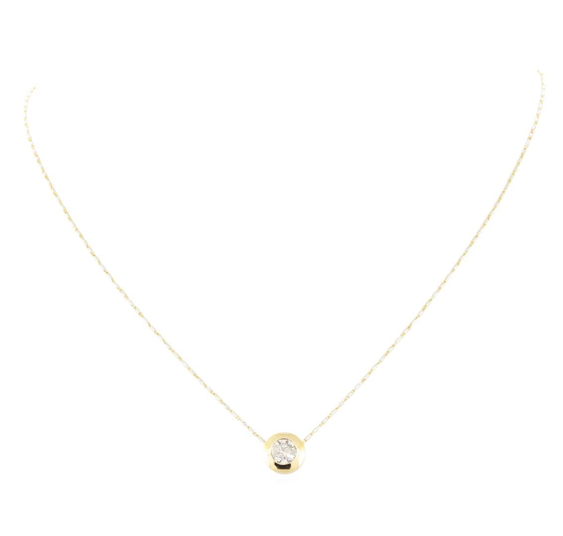 One electronically tested 14KT yellow gold ladies cast & assembled diamond solitaire necklace. The pendant features a bezel set round diamond, completed by an eighteen inch designer style white gold chain with spring ring clasp. Bright polish finish. Identified with markings of "14KT". Condition is new, good workmanship. Containing: One bezel set round brilliant cut diamond, measuring 6.50 - 6.50 x 4.00mm (depth est. approximate weight of 1.02ct. Graded in the setting. Clarity I-2 Color J Depth 61.5% Table 54.6% Total Weight of Diamonds 1.02 ct. Total Weight of Necklace 4.00 gm Estimated Retail Value $ 8,290.00 US