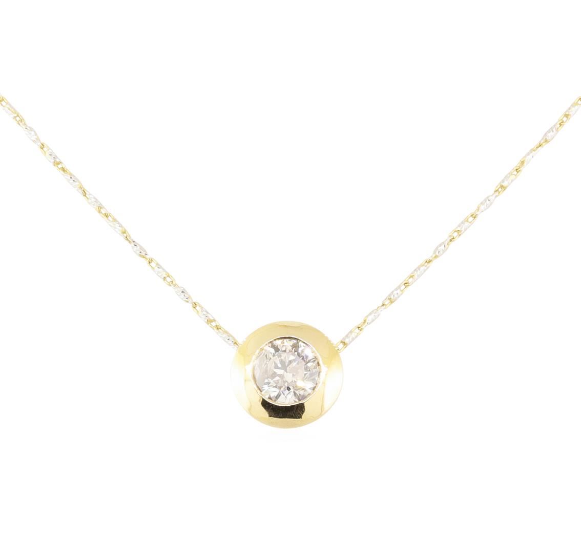 One electronically tested 14KT yellow gold ladies cast & assembled diamond solitaire necklace. The pendant features a bezel set round diamond, completed by an eighteen inch designer style white gold chain with spring ring clasp. Bright polish finish. Identified with markings of "14KT". Condition is new, good workmanship. Containing: One bezel set round brilliant cut diamond, measuring 6.50 - 6.50 x 4.00mm (depth est. approximate weight of 1.02ct. Graded in the setting. Clarity I-2 Color J Depth 61.5% Table 54.6% Total Weight of Diamonds 1.02 ct. Total Weight of Necklace 4.00 gm Estimated Retail Value $ 8,290.00 US