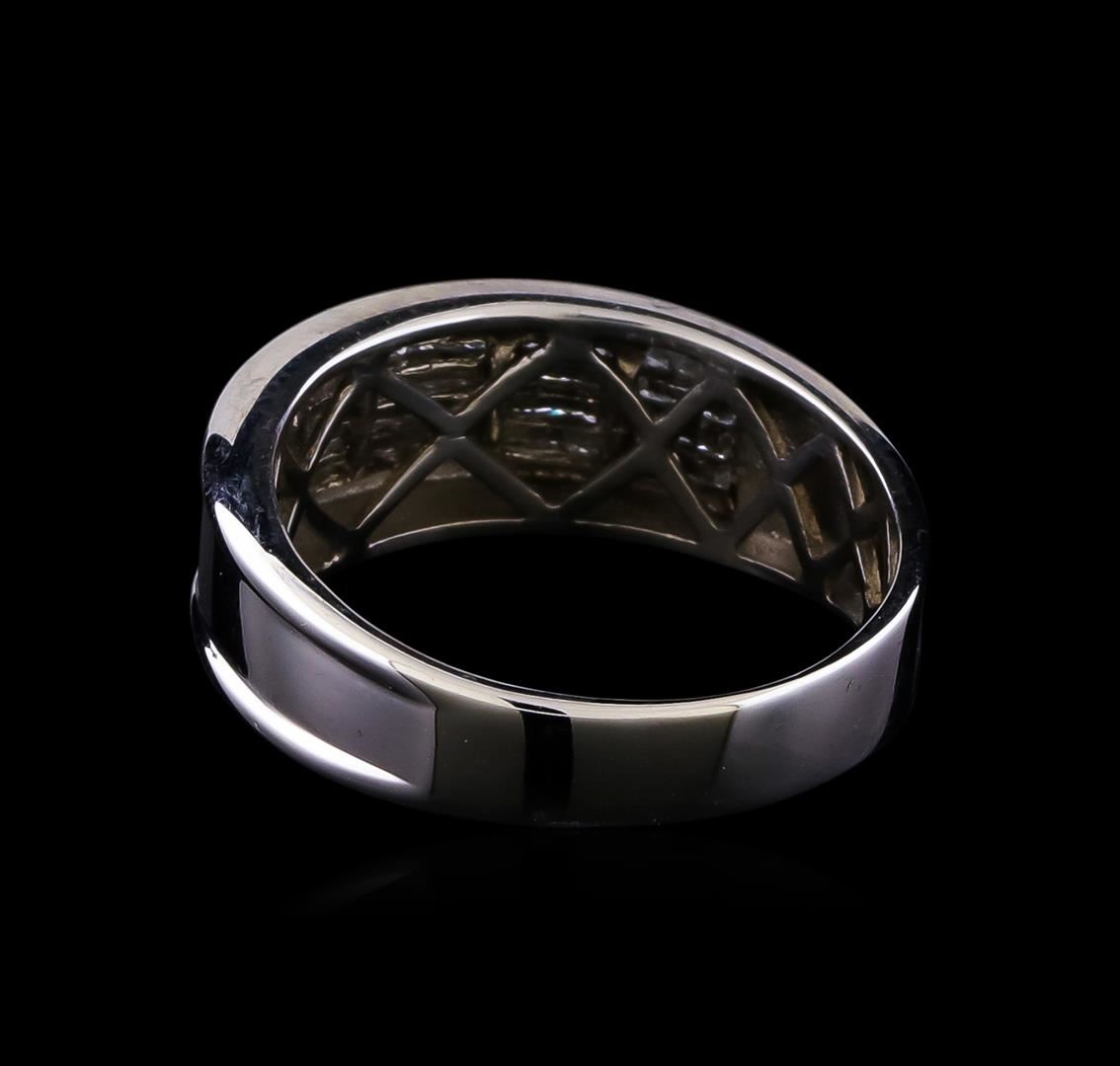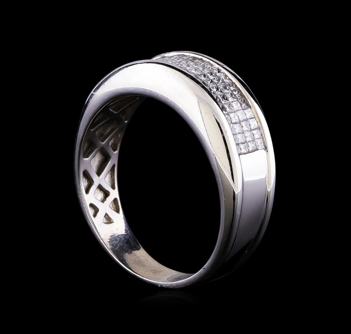 One electronically tested 14KT white gold gents cast diamond ring with a bright polish finish. The ring features a diamond set curvature, completed by a four and one-half millimeter wide band. Condition is good. Containing: Eighty invisible set princess cut diamonds, measuring 1.30 x 1.20 x 0.90mm (depth est.) approximate total weight of 80 Stones = 1.02ct. Graded in the setting. Clarity: VS-2 to SI-1 . Color: G - I. Total Weight of Diamonds 1.02ct.. Total Weight of Ring 6.91gm. AIG Appraised at $4,040.00.