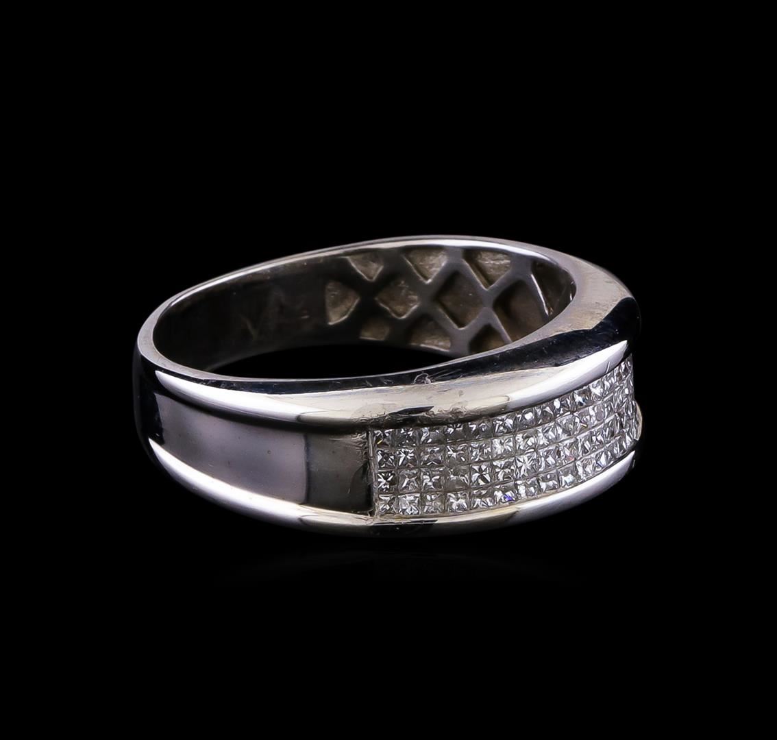 One electronically tested 14KT white gold gents cast diamond ring with a bright polish finish. The ring features a diamond set curvature, completed by a four and one-half millimeter wide band. Condition is good. Containing: Eighty invisible set princess cut diamonds, measuring 1.30 x 1.20 x 0.90mm (depth est.) approximate total weight of 80 Stones = 1.02ct. Graded in the setting. Clarity: VS-2 to SI-1 . Color: G - I. Total Weight of Diamonds 1.02ct.. Total Weight of Ring 6.91gm. AIG Appraised at $4,040.00.
