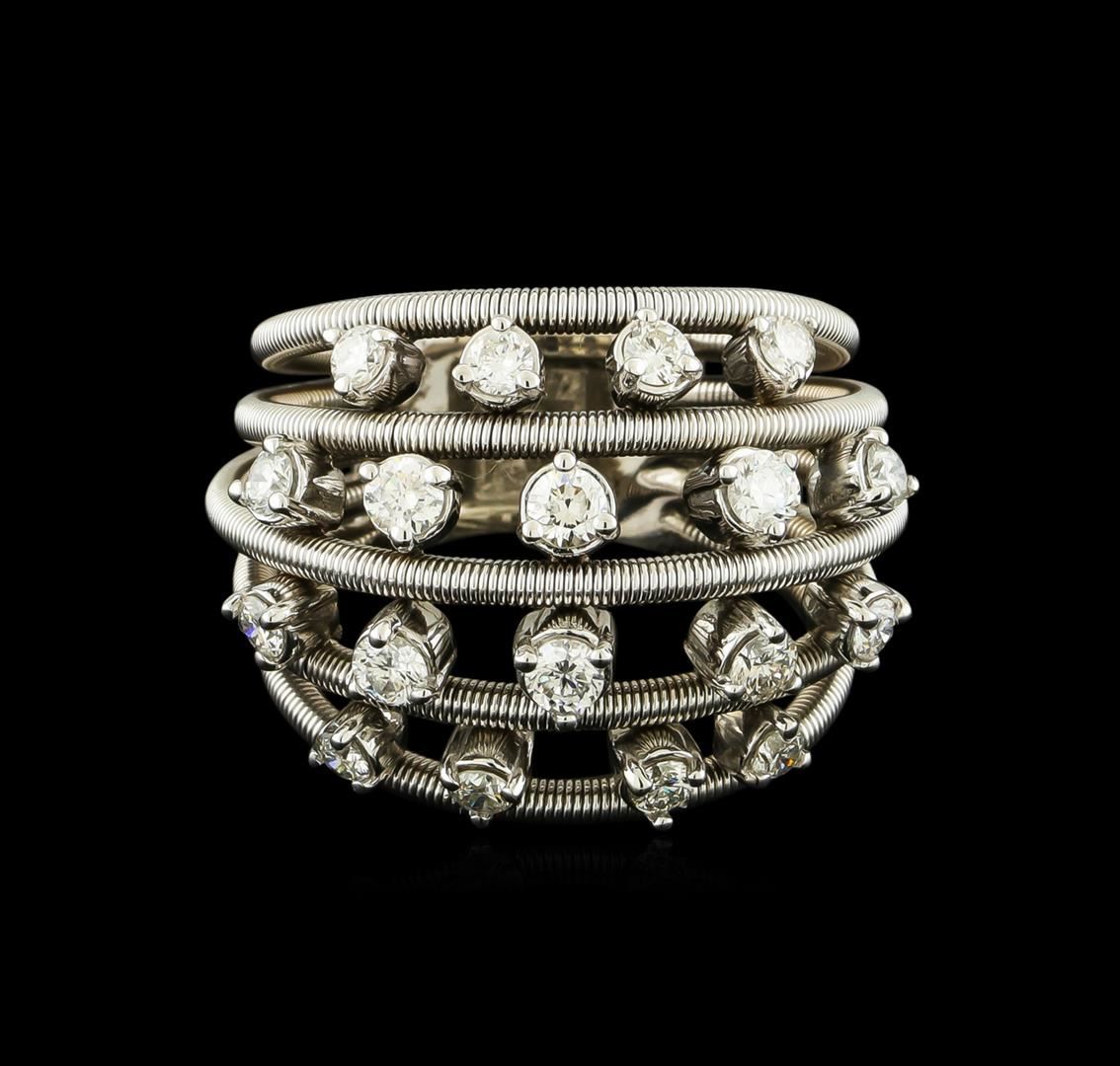 One electronically tested 14KT white gold lady's combination cast & assembled fashion ring with a bright polish finish. The featured lady's ring has a shank measuring 7.22 millimeters wide. Identified with markings of "K14". Condition is new, good workmanship. Containing: Six prong set round brilliant cut diamonds, measuring 2.80 - 2.70 x 1.71mm (depth est.) approximate total weight of 6 Stones = 0.48ct. Graded in the setting. Clarity: SI-1 to SI-2. Color: G - Good Twelve prong set round brilliant cut diamonds, measuring 2.30 - 2.20 x 1.40mm (depth est.) approximate total weight of 12 Stones = 0.54ct. Graded in the setting. Clarity: SI-1 to SI-2. Color: H - I. Cut Good. Total Weight of Diamonds 1.02ct. Total Weight of Ring 11.00gm. GAS Appraised at $4,425.00.