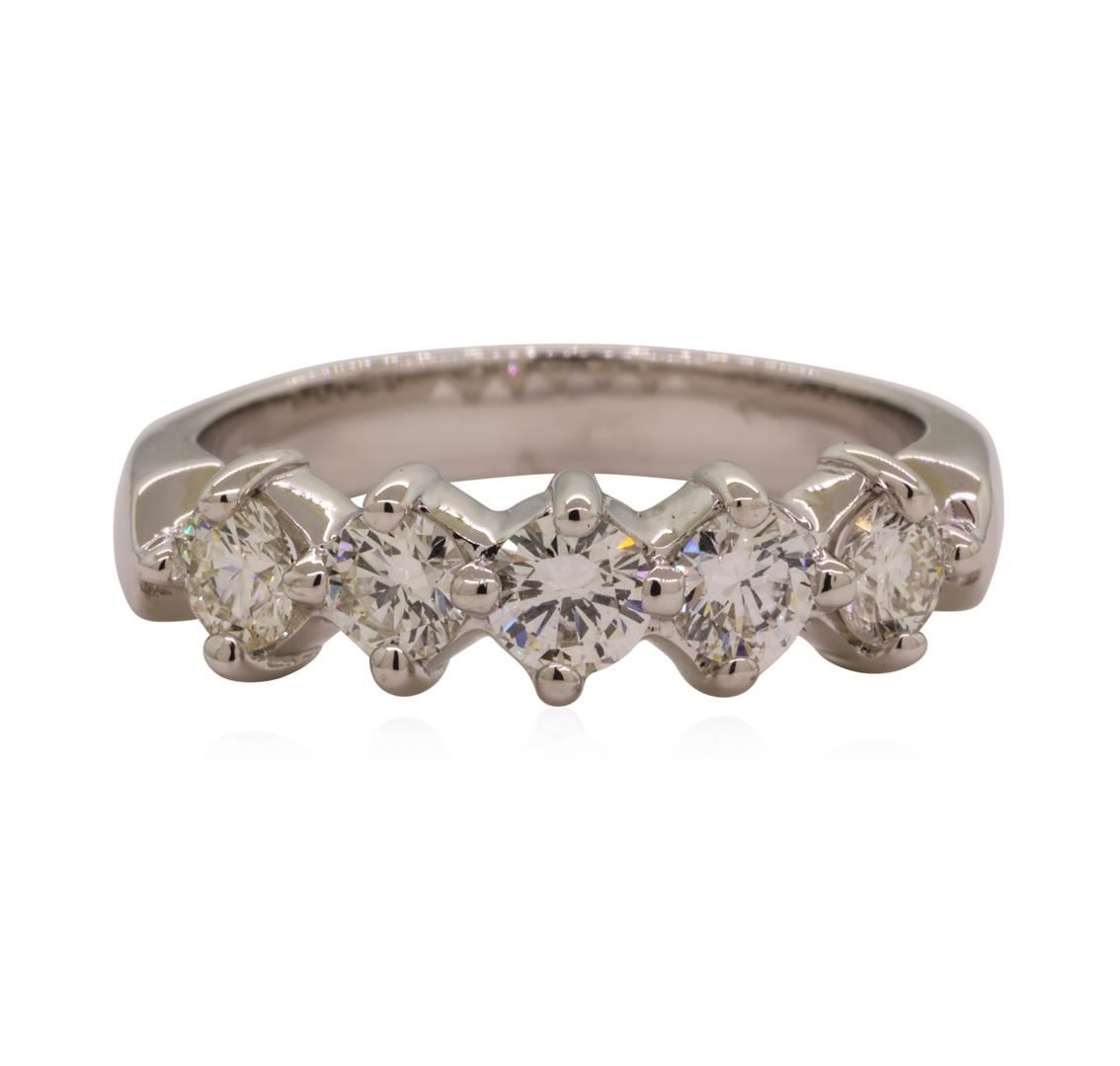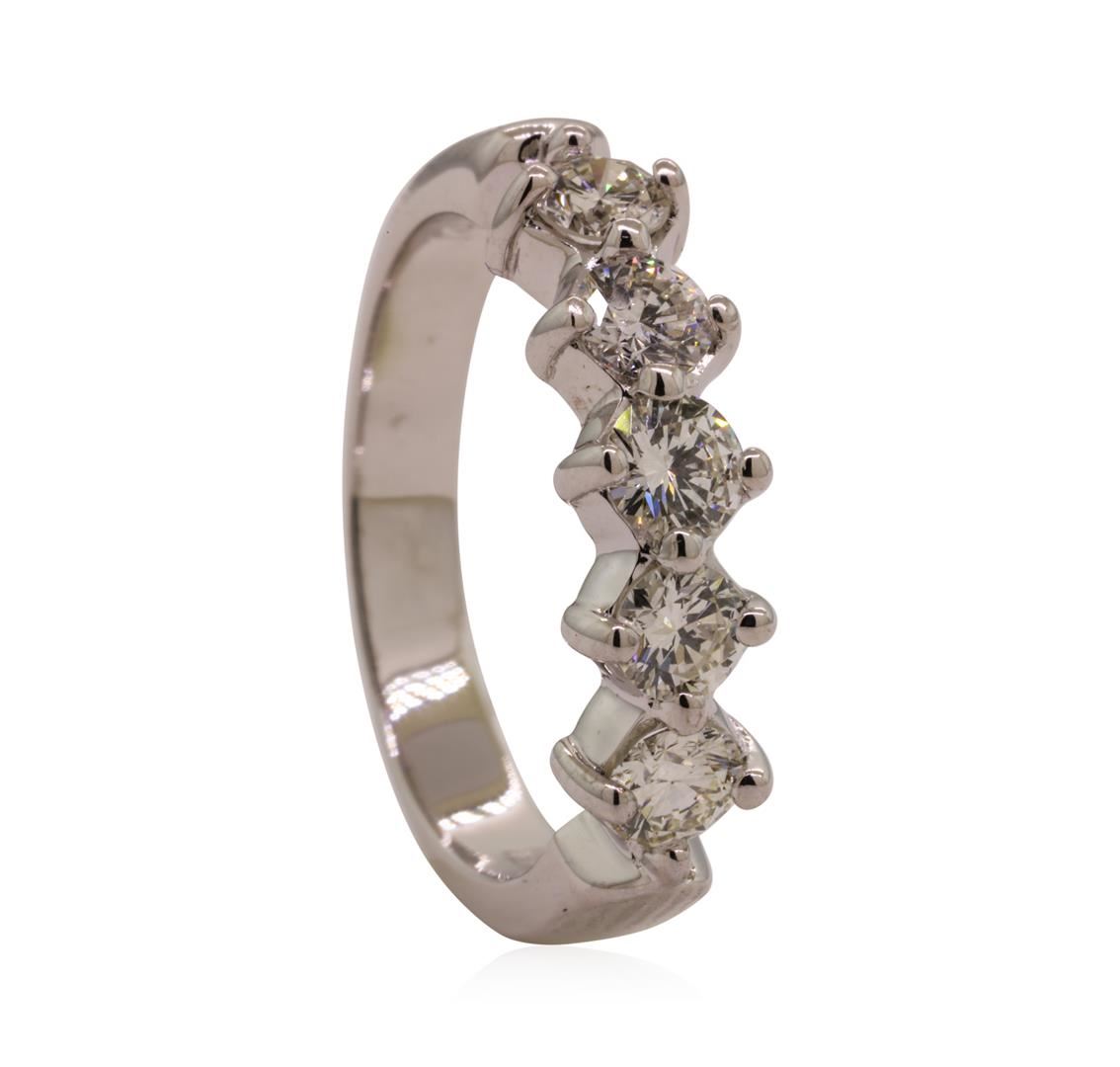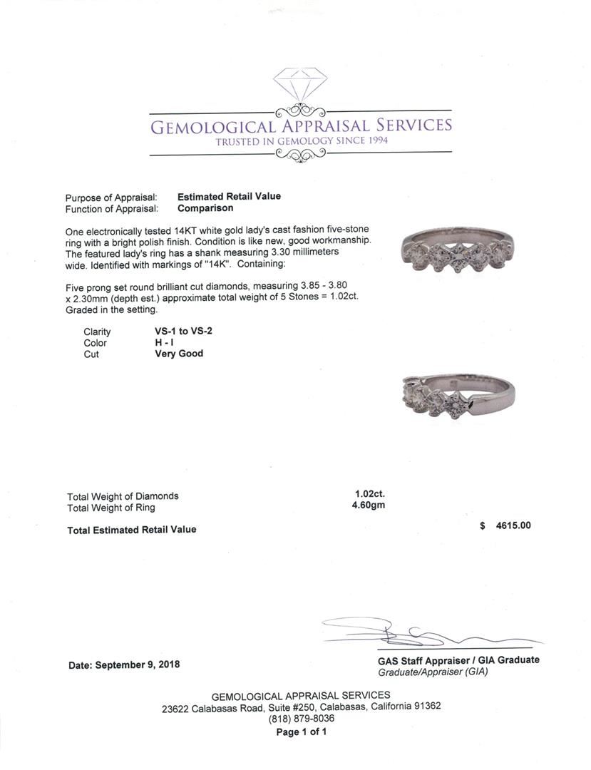 One electronically tested 14KT white gold lady's cast fashion five-stone ring with a bright polish finish. The featured lady's ring has a shank measuring 3.30 millimeters wide. Identified with markings of '14K'. Condition is like new, good workmanship. Containing: Five prong set round brilliant cut diamonds, measuring 3.85 - 3.80 x 2.30mm (depth est.) approximate total weight of 5 Stones = 1.02ct. Graded in the setting. Color H - I Clarity VS-1 to VS-2 Cut Very Good. Total Weight of Diamonds 1.02ct.. Total Weight of Ring 4.60gm GAS Appraised at $4615.00. GAS Appraised at $4,615.00.