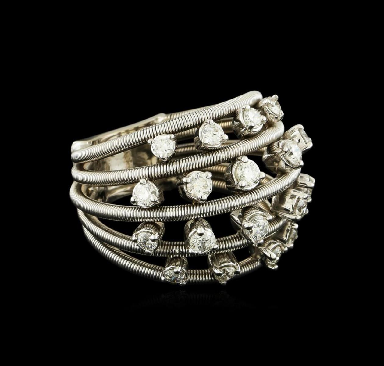 One electronically tested 14KT white gold lady's combination cast & assembled fashion ring with a bright polish finish. The featured lady's ring has a shank measuring 7.22 millimeters wide. Identified with markings of "K14". Condition is new, good workmanship. Containing: Six prong set round brilliant cut diamonds, measuring 2.80 - 2.70 x 1.71mm (depth est.) approximate total weight of 6 Stones = 0.48ct. Graded in the setting. Clarity: SI-1 to SI-2. Color: G - Good Twelve prong set round brilliant cut diamonds, measuring 2.30 - 2.20 x 1.40mm (depth est.) approximate total weight of 12 Stones = 0.54ct. Graded in the setting. Clarity: SI-1 to SI-2. Color: H - I. Cut Good. Total Weight of Diamonds 1.02ct. Total Weight of Ring 11.00gm. GAS Appraised.