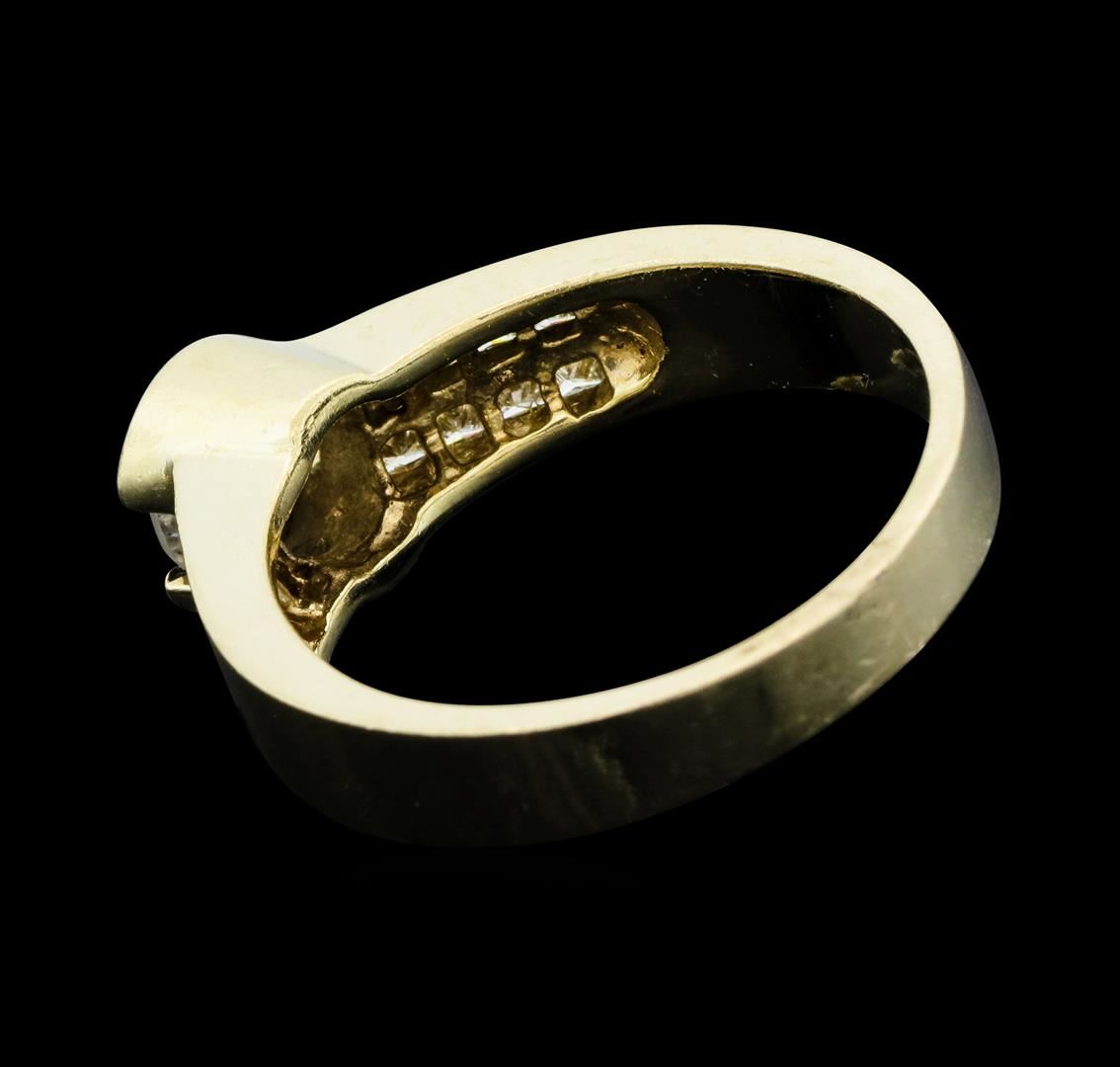One electronically tested 14KT yellow gold lady's cast wedding ring with a tapered cathedral shank with a bright polish finish. The featured lady's ring has a shank measuring 3.04 millimeters wide. Identified with markings of '14K'. Condition is like new, good workmanship. Containing: One half bezel set round brilliant cut diamond, measuring 5.50 - 5.45 x 3.50mm (depth est.) approximate weight of 0.64ct. Graded in the setting. Clarity I-1. Color: H Cut Good Sixteen channel set princess cut diamonds, measuring 1.70 x 1.50 x 1.13mm (depth est.) approximate total weight of 16 Stones = 0.38ct. Graded in the setting. Clarity SI-1 to SI-2. Color: I - J Cut Very Good. Total Weight of Diamonds 1.02ct.. Total Weight of Ring 5.70gm. GAS Appraised at $5,205.00.