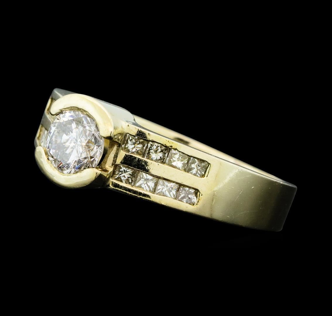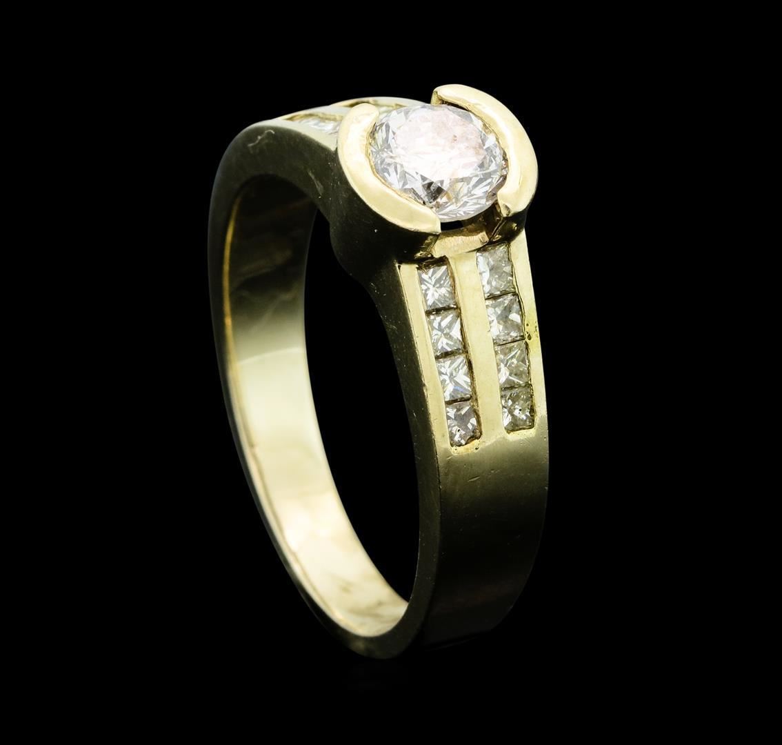 One electronically tested 14KT yellow gold lady's cast wedding ring with a tapered cathedral shank with a bright polish finish. The featured lady's ring has a shank measuring 3.04 millimeters wide. Identified with markings of '14K'. Condition is like new, good workmanship. Containing: One half bezel set round brilliant cut diamond, measuring 5.50 - 5.45 x 3.50mm (depth est.) approximate weight of 0.64ct. Graded in the setting. Clarity I-1. Color: H Cut Good Sixteen channel set princess cut diamonds, measuring 1.70 x 1.50 x 1.13mm (depth est.) approximate total weight of 16 Stones = 0.38ct. Graded in the setting. Clarity SI-1 to SI-2. Color: I - J Cut Very Good. Total Weight of Diamonds 1.02ct.. Total Weight of Ring 5.70gm. GAS Appraised.