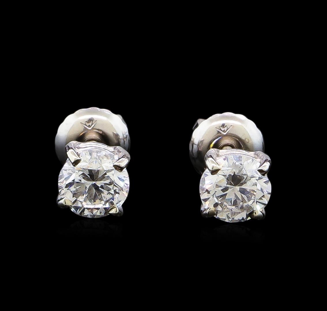 One pair electronically tested 14KT white gold lady's combination cast & assembled diamond stud earrings with threaded posts and screw-on/screw-off backs with a basket setting with a bright polish finish. Identified with markings of "14K". Condition is new, good workmanship. Containing: One prong set round brilliant cut diamond, measuring 5.03 - 4.99 x 3.36mm (depth est.) approximate weight of 0.52ct. Graded in the setting. Clarity: SI-2. Color: Good One prong set round brilliant cut diamond, measuring 5.02 - 5.00 x 3.16mm (depth est.) approximate weight of 0.50ct. Graded in the setting. Clarity: SI-1. Color: Good. Total Weight of Diamonds 1.02ct. Total Weight of Stud Earrings 1.00gm. GAS Appraised at $7,230.00.