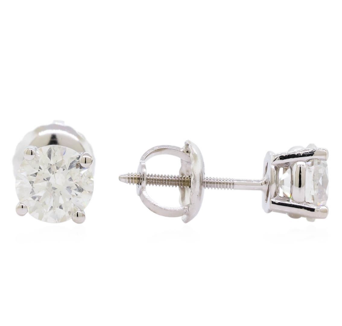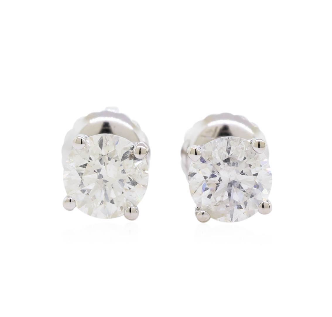 One pair electronically tested 14KT white gold lady's combination cast & assembled stud earrings with threaded posts and screw-on/screw-off backs with a bright polish finish. Identified with markings of "14K". Condition is new, good workmanship. Containing: Two prong set round brilliant cut diamonds, measuring 5.04 - 4.98 x 3.21mm (depth est.) approximate total weight of 2 Stones = 1.02ct. Graded in the setting. Clarity: I-1. Color: F - Good. Total Weight of Diamonds 1.02ct. Total Weight of Earrings 1.00gm. GAS Appraised at $5,555.00.
