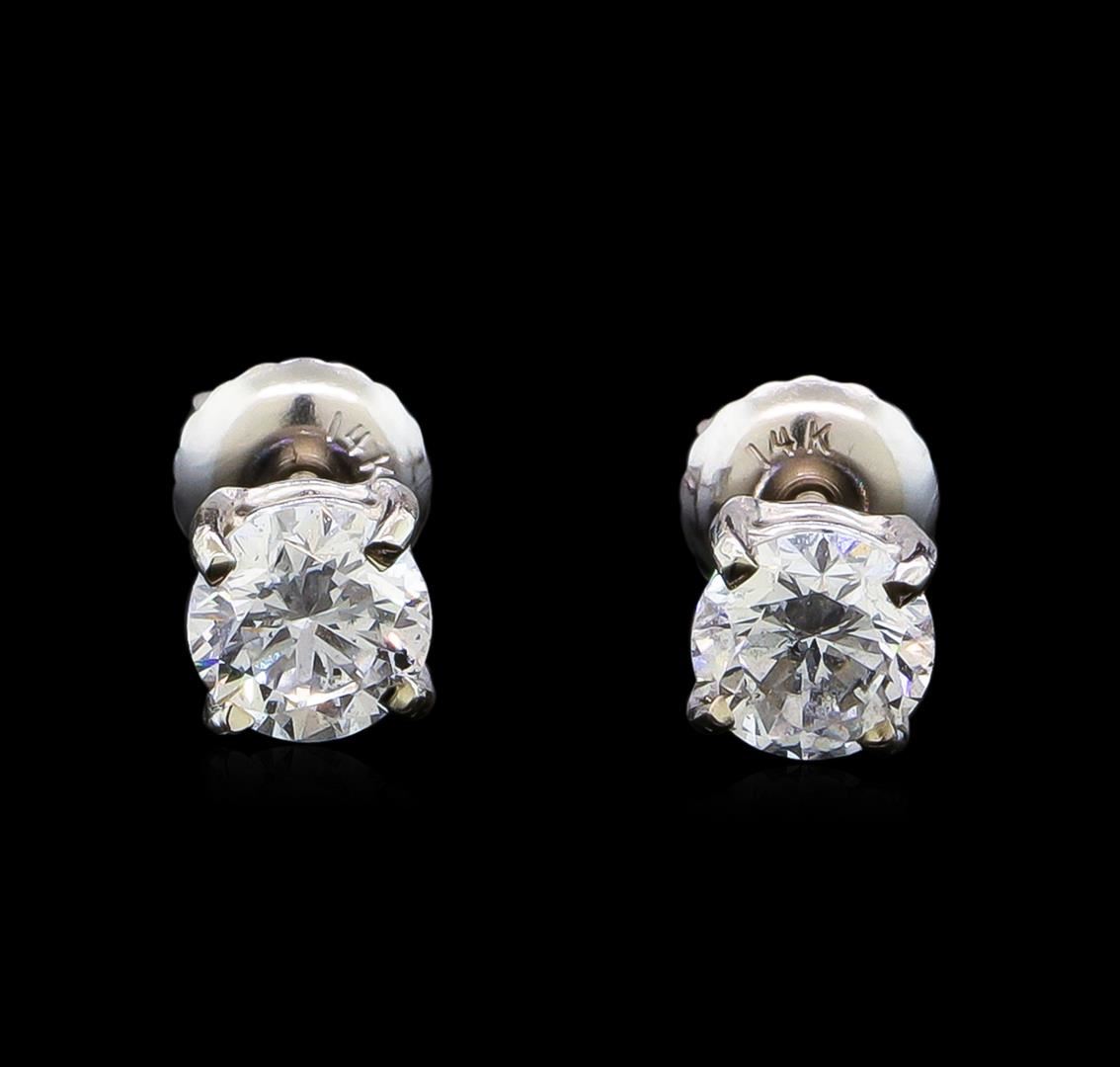 One pair electronically tested 14KT white gold lady's combination cast & assembled diamond stud earrings with threaded posts and screw-on/screw-off backs with a basket setting with a bright polish finish. Identified with markings of "14K". Condition is new, good workmanship. Containing: One prong set round brilliant cut diamond, measuring 5.01 - 4.98 x 3.35mm (depth est.) approximate weight of 0.51ct. Graded in the setting. Clarity: SI-2. Color: Good One prong set round brilliant cut diamond, measuring 4.99 - 4.97 x 3.35mm (depth est.) approximate weight of 0.51ct. Graded in the setting. Clarity: SI-1. Color: Good. Total Weight of Diamonds 1.02ct. Total Weight of Stud Earrings 1.00gm. GAS Appraised at $6,020.00.