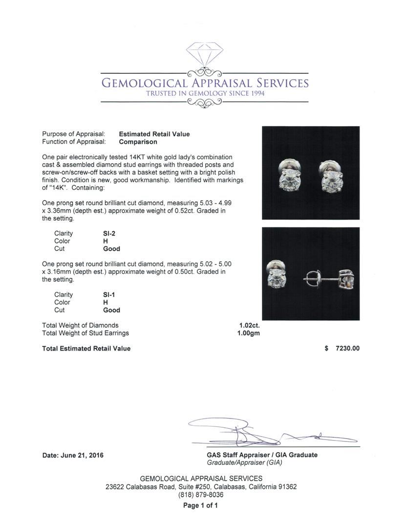 One pair electronically tested 14KT white gold lady's combination cast & assembled diamond stud earrings with threaded posts and screw-on/screw-off backs with a basket setting with a bright polish finish. Identified with markings of "14K". Condition is new, good workmanship. Containing: One prong set round brilliant cut diamond, measuring 5.03 - 4.99 x 3.36mm (depth est.) approximate weight of 0.52ct. Graded in the setting. Clarity: SI-2. Color: Good One prong set round brilliant cut diamond, measuring 5.02 - 5.00 x 3.16mm (depth est.) approximate weight of 0.50ct. Graded in the setting. Clarity: SI-1. Color: Good. Total Weight of Diamonds 1.02ct. Total Weight of Stud Earrings 1.00gm. GAS Appraised at $7,230.00.