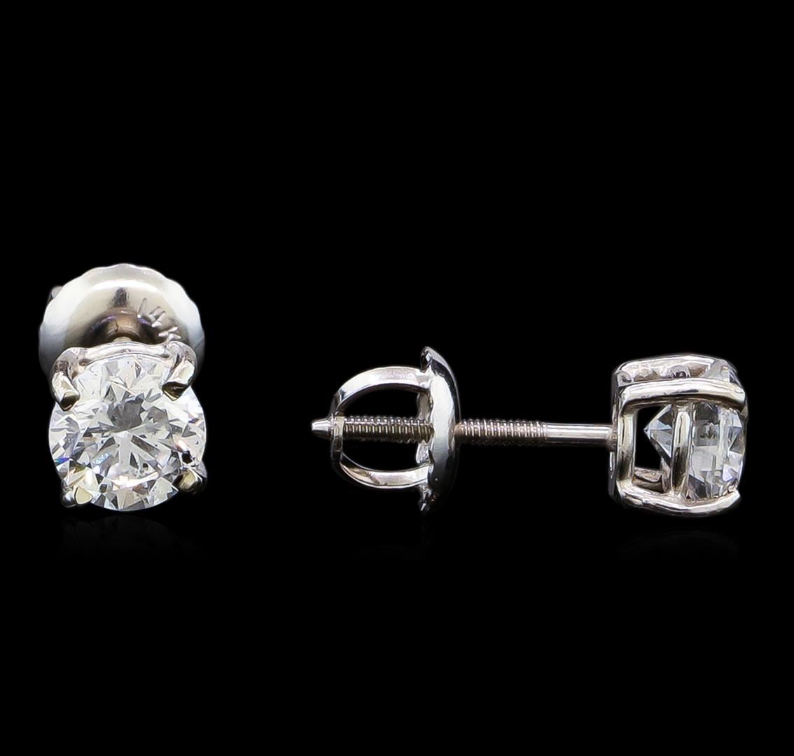 One pair electronically tested 14KT white gold lady's combination cast & assembled diamond stud earrings with threaded posts and screw-on/screw-off backs with a basket setting with a bright polish finish. Identified with markings of "14K". Condition is new, good workmanship. Containing: One prong set round brilliant cut diamond, measuring 5.01 - 4.98 x 3.35mm (depth est.) approximate weight of 0.51ct. Graded in the setting. Clarity: SI-2. Color:  Good One prong set round brilliant cut diamond, measuring 4.99 - 4.97 x 3.35mm (depth est.) approximate weight of 0.51ct. Graded in the setting. Clarity: SI-1. Color:  Good. Total Weight of Diamonds 1.02ct. Total Weight of Stud Earrings 1.00gm. GAS Appraised at $6,020.00.