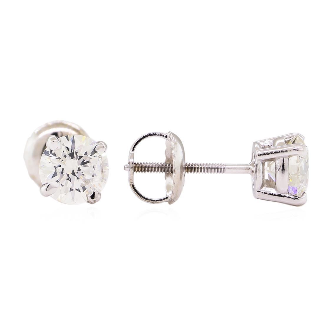 One pair electronically tested 14KT white gold lady's combination cast & assembled stud earrings with threaded posts and screw-on/screw-off backs with a bright polish finish. Identified with markings of "14K". Condition is new, good workmanship. Containing: Two prong set round brilliant cut diamonds, measuring 5.14 - 5.11 x 3.18mm (depth est.) approximate total weight of 2 Stones = 1.02ct. Graded in the setting. Clarity: SI-1 to SI-2. Color: G - I. Cut Very Good. Total Weight of Diamonds 1.02ct. Total Weight of Earrings 1.00gm. GAS Appraised.