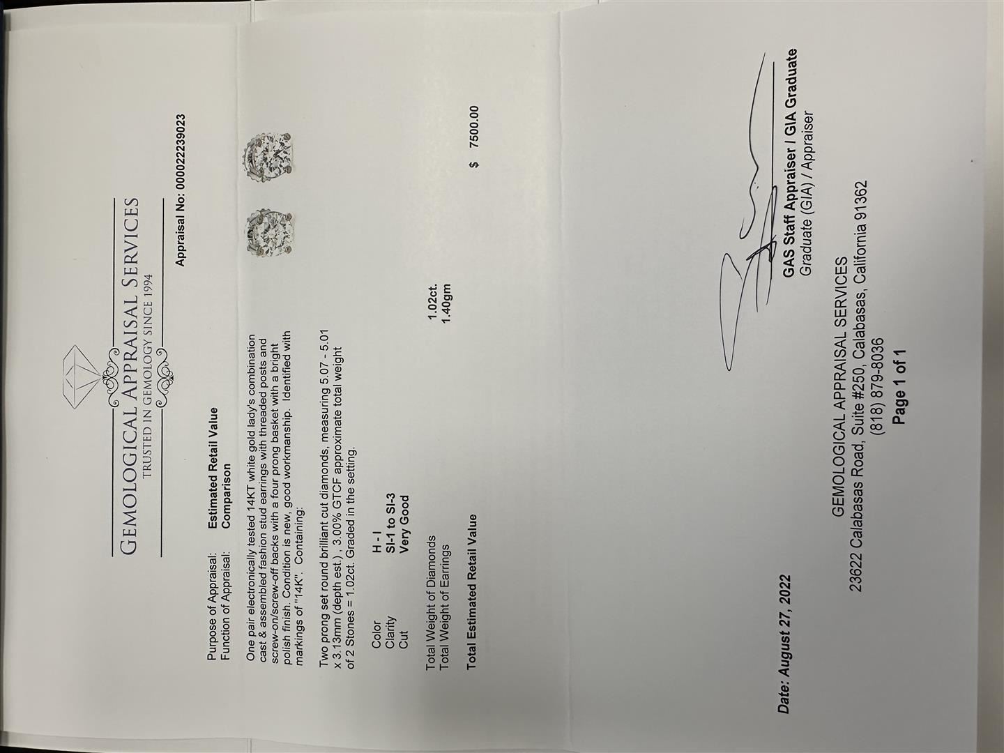 One pair electronically tested 14KT white gold lady's combination cast assembled fashion stud earrings with threaded posts and screw-on/screw-off backs with four prong basket with bright polish finish. Condition is new, good workmanship. Identified with markings of 14K. Containing: 2 prong set round brilliant cut diamonds, approximate total weight of 2 stones = 1.02 ctw. Graded in the setting. Total weight of Diamonds: 1.02 ctw. Total estimated retail value: $7500