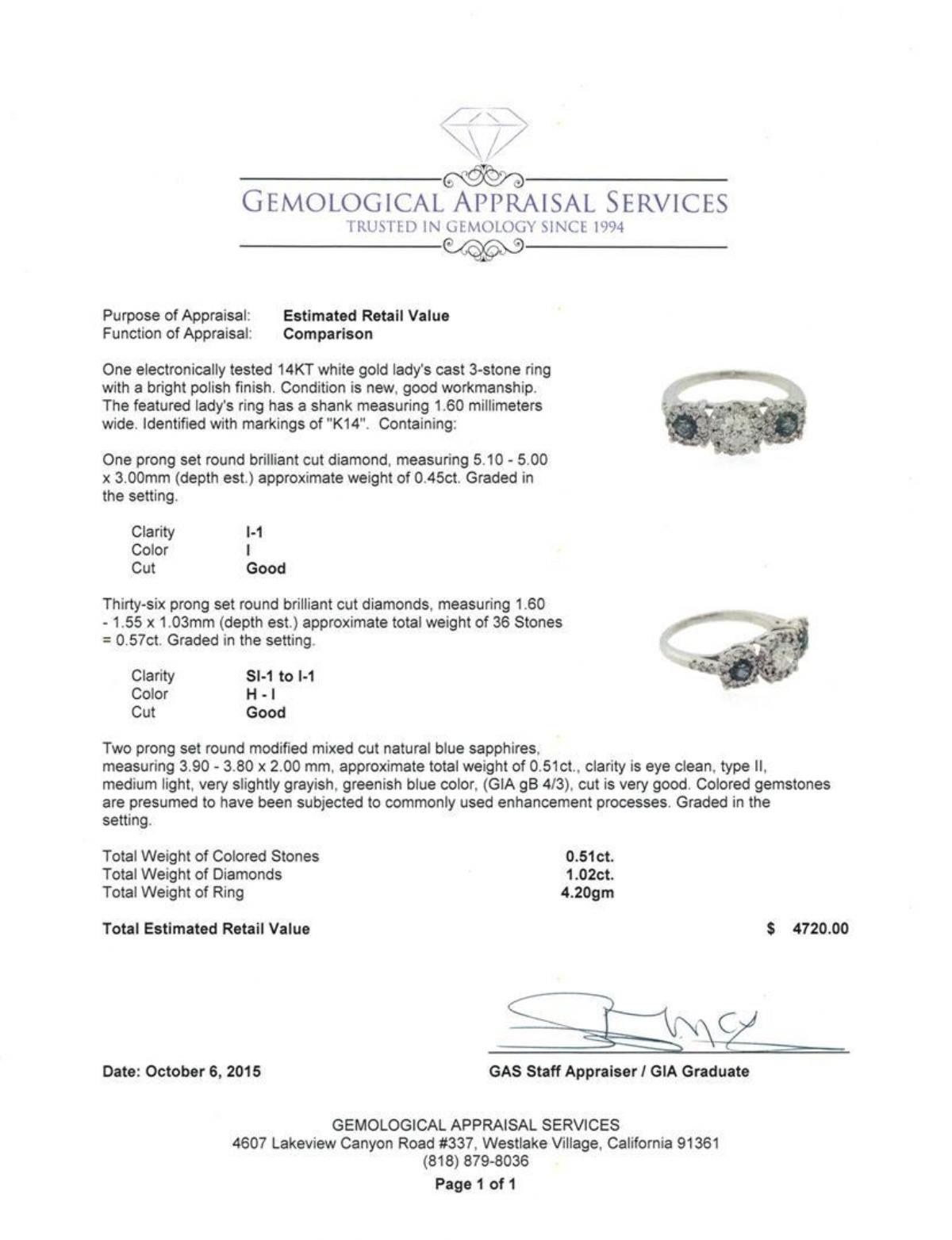 One electronically tested 14KT white gold lady's cast 3-stone ring with a bright polish finish. The featured lady's ring has a shank measuring 1.60 millimeters wide. Identified with markings of "K14". Condition is new, good workmanship. Containing: One prong set round brilliant cut diamond, measuring 5.10 - 5.00 x 3.00mm (depth est.) approximate weight of 0.45ct. Graded in the setting. Clarity: I-1. Color: I. Cut Good Thirty-Six prong set round brilliant cut diamonds, measuring 1.60 - 1.55 x 1.03mm (depth est.) approximate total weight of 36 Stones = 0.57ct. Graded in the setting. Clarity: SI-1 to I-1. Color: H - I. Cut Good Two prong set round modified mixed cut natural blue sapphires, measuring 3.90 - 3.80 x 2.00 mm, approximate total weight of 0.51ct., clarity is eye clean, type II, medium light, very slightly grayish, greenish blue color, (GIA gB 4/3), cut is very good. Colored gemstones are presumed to have been subjected to commonly used enhancement processes. Graded in the setting. Total Weight of Colored Stones 0.51ct. Total Weight of Diamonds 1.02ct. Total Weight of Ring 4.20gm. GAS Appraised.