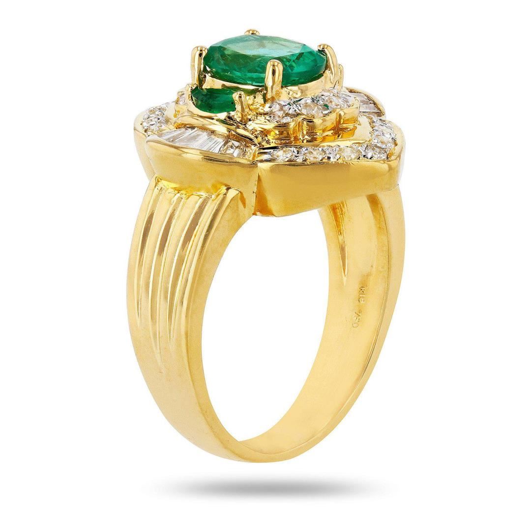 One electronically tested 18KT yellow gold ladies cast and assembled emerald and diamond ring. Condition is good. The featured emerald is set within a tiered diamond bezel with mirroring emerald accents on either side, supported by grooved tapering shoulders, completed by a four millimeter wide band. Bright polish finish with rhodium accents. Identified with markings of "K18". Containing: One prong set oval mixed cut natural emerald, measuring 8.00mm x 6.00mm x 3.90mm, approximate weight of 0.90ct., clarity is moderately included, type III, medium, very slightly grayish, very slightly bluish green color, (GIA vslbG 5/3), cut is good. Transmitting light with some distortion, transparent to translucent. Naturally occurring internal and external characteristics are present. Graded in the setting. Two prong set marquise mixed cut natural emeralds, measuring 3.50mm x 2.20mm x 1.43mm, approximate total weight of 0.12ct., clarity is heavily included, type III, medium, moderately strong, green color, (GIA G 5/4), cut is good. Transmitting light somewhat diffusely, transparent to translucent. Naturally occurring internal and external characteristics are present. Measurements and the color grade are an average for the pair. Graded in the setting. Twenty-two prong set round brilliant cut diamonds, measuring 1.70mm to 1.40mm x 0.93mm (depth est.) approximate total weight of 22 Stones = 0.30ct. The clarity and color grade reflect the overall average for the group. Graded in the setting. Clarity SI2 to I2 Color I - K Ten channel set baguette cut (tapered) diamonds approximate total weight of 10 Stones = 0.27ct. The clarity and color grade reflect the overall average for the group. Graded in the setting. Clarity SI1 to I1 Color G - I Total Weight of Colored Stones 1.02ct. Total Weight of Diamonds 0.57ct. Total Weight of Ring 9.20 gm Size: 6 1/2