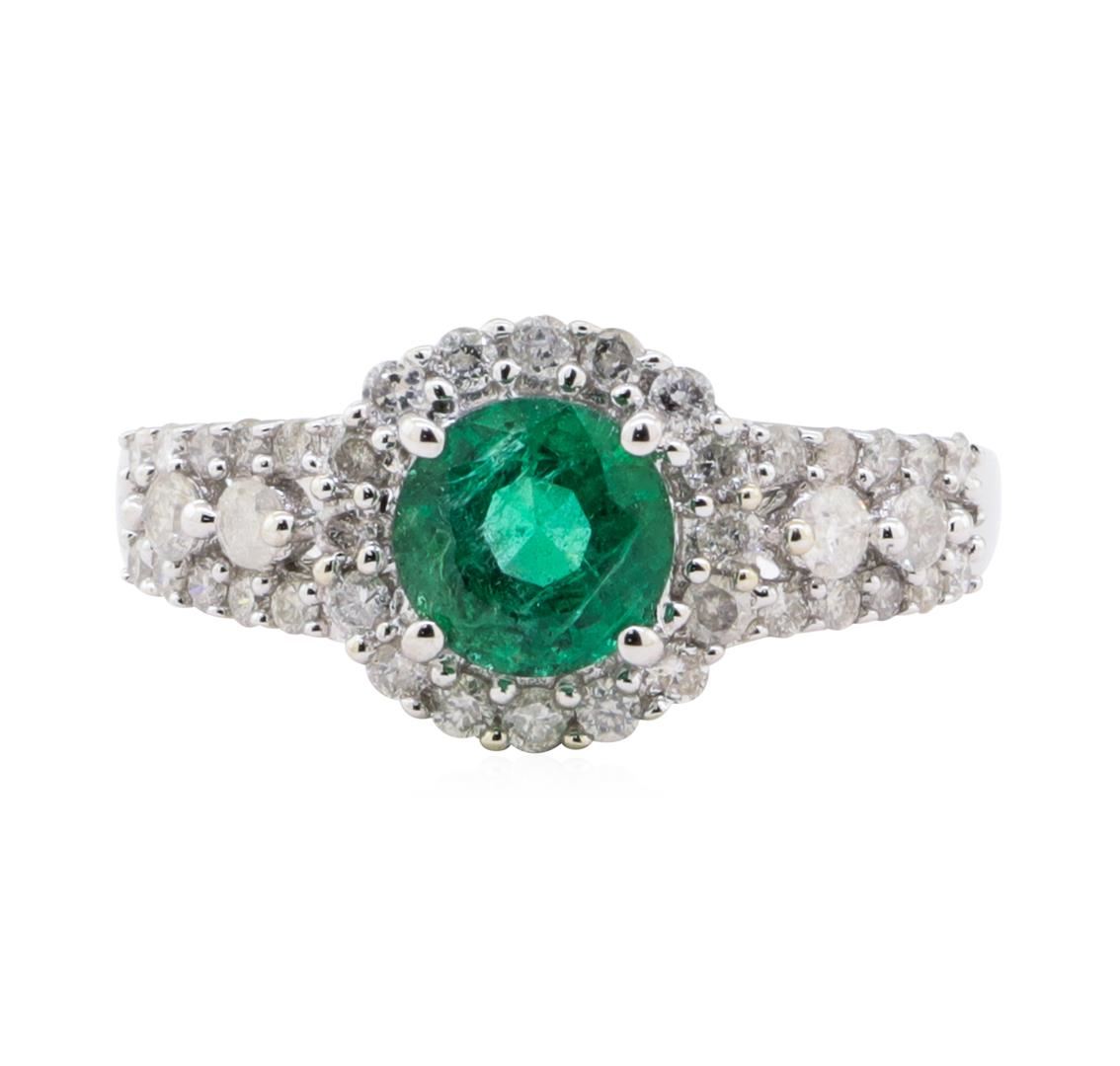 One polished, stamped, and tested 14K white gold ring with a bright finish. The ring is mounted with: 1 genuine emerald center stone weighing approximately 1.02 carat, and 40 genuine round diamonds weighing approximately 0.57 carats. This item weighs 33 grams, condition is new, excellent workmanship. MAIN GEMSTONE Species: Natural Beryl Variety: Emerald Shape: Round Cutting Style: Brilliant Cut Crown Step Cut Pavilion Measurements: 6.32 - 6.35 x 4.37 mm Weight: 1.02 carat Color: Green Cut Grade: Very Good Refractive Index: 1.564 - 1.595 DR Birefringence: 0.005 to 0.009 Hardness: 7.5 - 8 ADJACENT GEMSTONE ON RING Identity: Natural Diamond Shape: Round Cutting Style: Brilliant Cut Quantity: 40 Diamonds Measurements: 1.1 - 2.0 mm Total Weight: 0.57 carats Color Grade: I - J Clarity Grade: I1 - I2 Refractive Index: 2.41 8 Hardness: l0 EMERALD WEIGHT: 1.02 ct TOTAL DIAMOND WEIGHT: 0.57 cts WEIGHT OF ITEM: 3.3 grams GOLD CONTENT: 14K White Gold ESTIMATED RETAIL REPLACEMENT VALUE: USD $ 4,188.00 AIG Appraised.