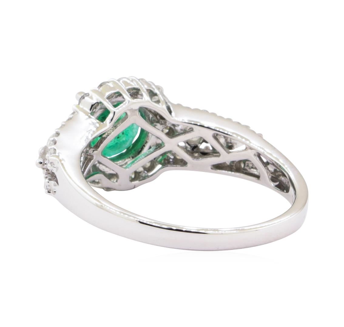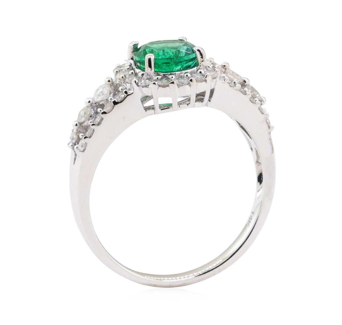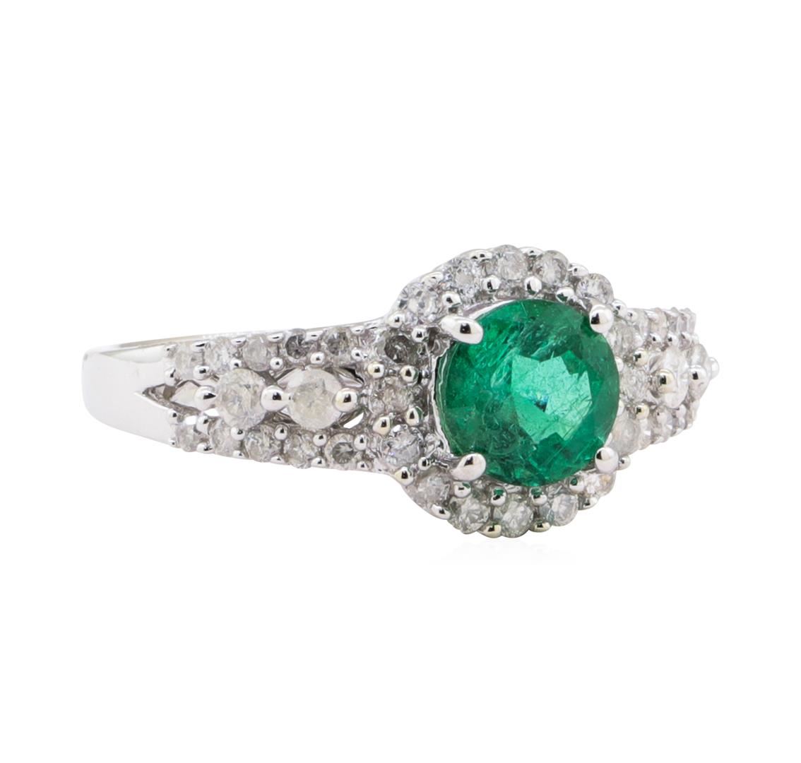One polished, stamped, and tested 14K white gold ring with a bright finish. The ring is mounted with: 1 genuine emerald center stone weighing approximately 1.02 carat, and 40 genuine round diamonds weighing approximately 0.57 carats. This item weighs 33 grams, condition is new, excellent workmanship. MAIN GEMSTONE Species: Natural Beryl Variety: Emerald Shape: Round Cutting Style: Brilliant Cut Crown Step Cut Pavilion Measurements: 6.32 - 6.35 x 4.37 mm Weight: 1.02 carat Color: Green Cut Grade: Very Good Refractive Index: 1.564 - 1.595 DR Birefringence: 0.005 to 0.009 Hardness: 7.5 - 8 ADJACENT GEMSTONE ON RING Identity: Natural Diamond Shape: Round Cutting Style: Brilliant Cut Quantity: 40 Diamonds Measurements: 1.1 - 2.0 mm Total Weight: 0.57 carats Color Grade: I - J Clarity Grade: I1 - I2 Refractive Index: 2.41 8 Hardness: l0 EMERALD WEIGHT: 1.02 ct TOTAL DIAMOND WEIGHT: 0.57 cts WEIGHT OF ITEM: 3.3 grams GOLD CONTENT: 14K White Gold ESTIMATED RETAIL REPLACEMENT VALUE: USD $ 4,188.00