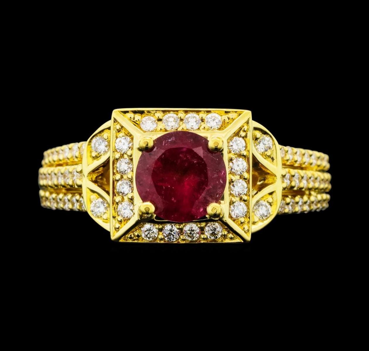 One electronically tested 18KT yellow gold lady's cast fashion ring with a split cathedral shank with a halo with a bright polish finish. The featured lady's ring has a shank measuring 2.63 millimeters wide. Identified with markings of '18K'. Condition is new, good workmanship. Containing: One prong set round modified brilliant cut natural pink tourmaline, measuring 6.51 - 6.48 x 4.11 mm, (depth est.) approximate weight of 1.02ct., clarity is heavily included, medium, moderately strong, slightly purplish red color, (GIA slpR 5/4), cut is good. Transmitting light somewhat diffusely, semi-transparent to translucent. Naturally occurring internal & external characteristics are present. Colored gemstones are presumed to have been subjected to commonly used enhancement processes. Graded in the setting. Twenty prong set round brilliant cut diamonds, measuring 1.50 - 1.35 x 0.89mm (depth est.) approximate total weight of 20 Stones = 0.22ct. Graded in the setting. Color H - I Clarity VS-1 to VS-2 Cut Very Good Eighty-Six prong set round brilliant cut diamonds, measuring 1.20 - 1.10 x 0.71mm (depth est.) approximate total weight of 86 Stones = 0.48ct. Graded in the setting. Color G - I Clarity VS-1 to SI-1 Cut Very Good. Total Weight of Colored Stones 1.02ct.. Total Weight of Diamonds 0.70ct.. Total Weight of Ring 7.60gm. GAS Appraised.