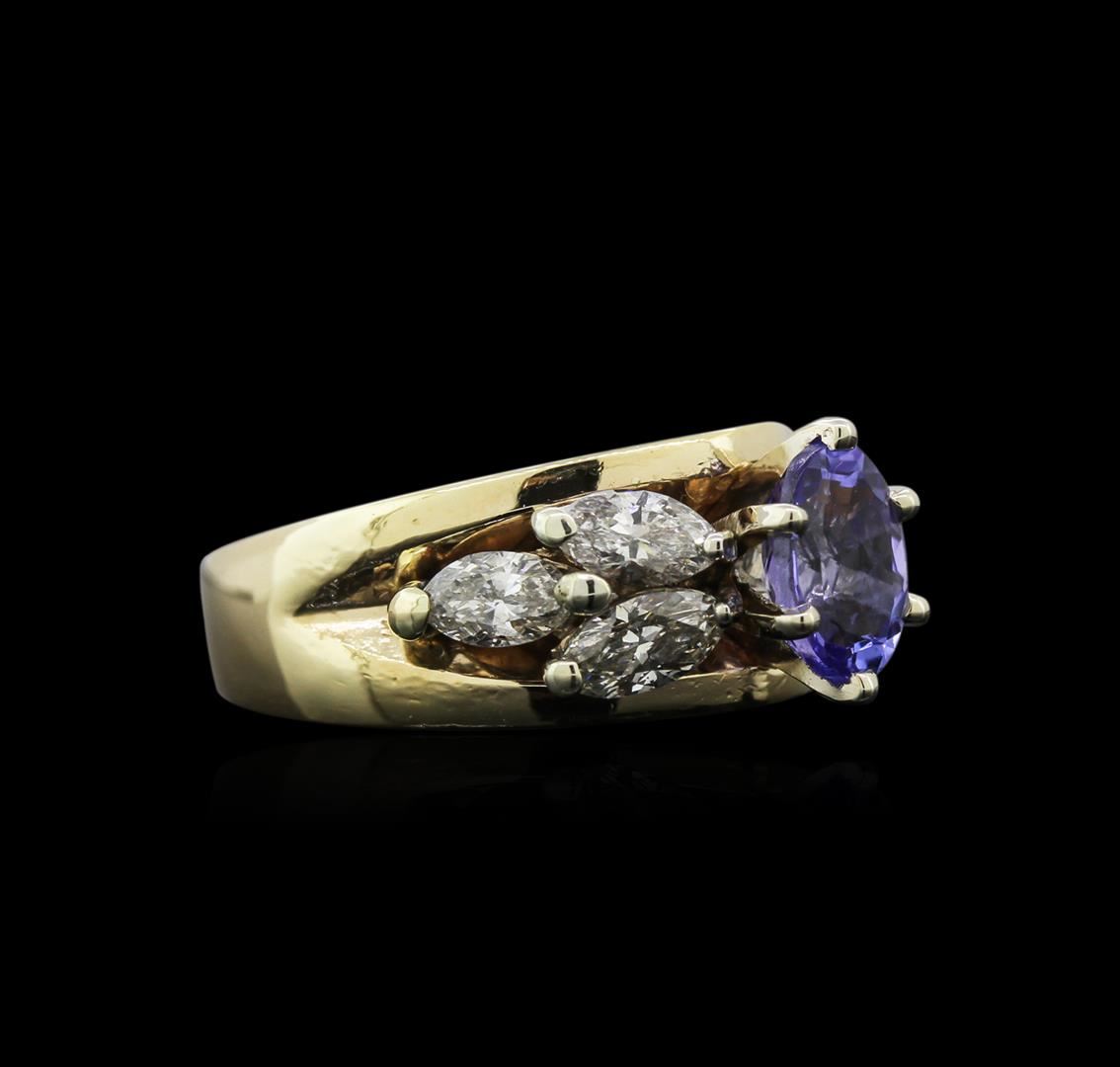 One ring featuring: 14KT yellow gold weighing 6.78 grams containing one prong set oval shape tanzanite center stone with a total weight of 1.02ct and prong set marquise cut diamonds with a total weight of 0.50ct.