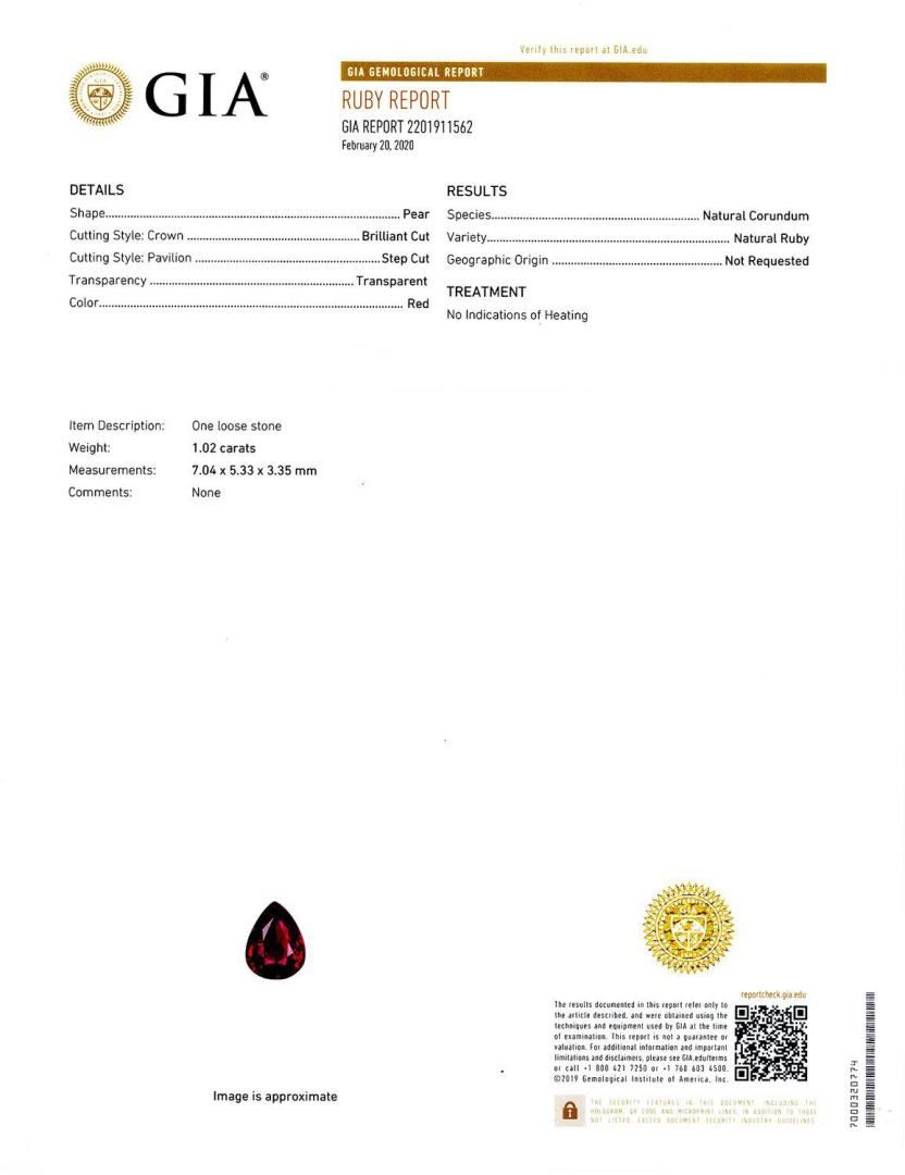 One electronically tested platinum ladies cast ruby & diamond ring. The featured ruby is set within a diamond bezel, completed by a two millimeter pipe cut wide band. Bright polish finish. Trademark is Orianne. Identified with markings of "950". Condition is new, good workmanship Containing: One prong set pear brilliant cut natural ruby, measuring 7.04 x 5.33 x 3.35mm, exact weight 1.02ct., clarity is moderately included, type II, dark, moderately strong, red color, (GIA R 7/4), cut is good. Transmitting light with no distortion, transparent. Naturally occurring internal & external characteristics are present, including a surface feather & a cavity situated along the girdle. Graded loose prior to setting in the GIA Laboratory, Report No. 2201911562. The report is attached. No Indications of Heating. EXTREMELY RARE UNHEATED RUBY G.I.A. CERTIFIED Seventeen prong set round brilliant cut diamonds, measuring 1.30 - 1.20 x 0.75mm (depth est.) approximate total weight of 17 Stones = 0.14ctw. Graded in the setting. Clarity VS2 to SI2 Color F - H Total Weight of Colored Stones 1.02ct. Total Weight of Diamonds 0.14ctw. Total Weight of Ring 7.40 gm Size: 6