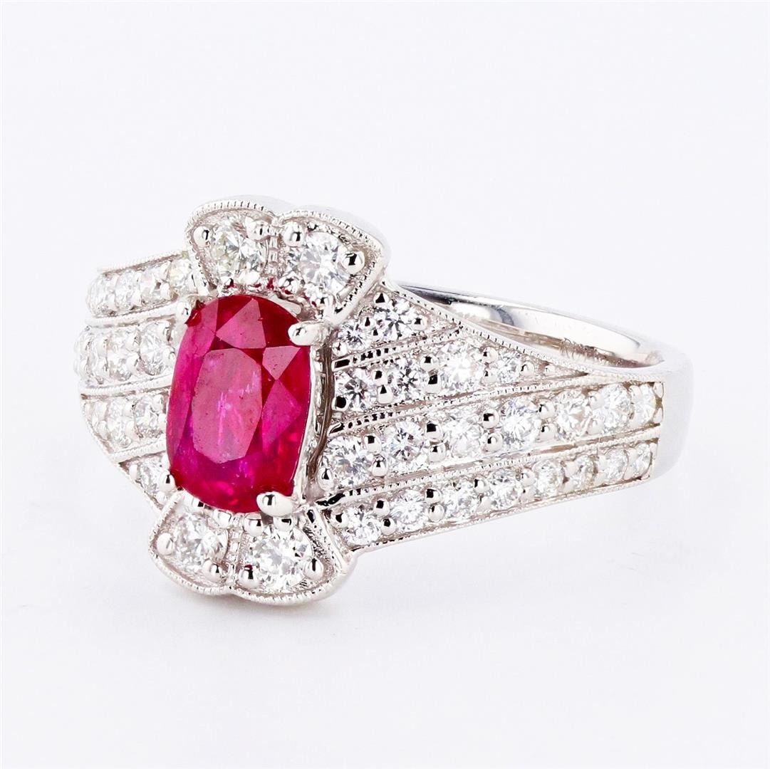 1.02ct UNHEATED Ruby and 0.79ctw Diamond 18K White Gold Ring (GIA CERTIFIED). Eighteen karat (18K) white gold natural ruby corundum and diamond ring. An oval cut natural ruby corundum gemstone is mounted in the center of the ring. Round brilliant cut diamonds accent the ring around and on both sides of the center gemstone. The ring has a gross weight of 4.4 Grams. Reference: GIA Ruby Report 02225130909 NATURAL GEMSTONE GEMSTONE: Ruby Corundum NATURE: Natural SHAPE: 0val Brilliant, Faceted Cut WEIGHT: 1.02 carat total DIMENSIONS: 6.84 x 4.78 x 3.15mm CLARITY: Type 2 COLOR: Red (5/5) SYMMETRY: .Excellent COLOR INTENSITY: Intense TRANSPARENCY: Transparent TONE: Dark NATURAL DIAMOND SHAPE: Round Brilliant Cut WEIGHT: 0.79 carat total (46pcs.) DIMENSIONS: 2.3 x 1.0mm AVERAGE CLARITY: VS2 to SI1 AVERAGE COLOR: F - G SYMMETRY: Excellent POLISH: Excellent METAL METAL: Gold PURITY: 18K (750) COLOR: White CONDITION: Excellent FINISH: High Polish