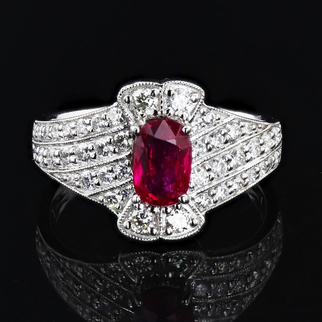 Eighteen karat (18K) white gold natural ruby corundum and diamond ring. An oval cut natural ruby corundum gemstone is mounted in the center of the ring. Round brilliant cut diamonds accent the ring around and on both sides of the center gemstone. The ring has a gross weight of 4.4 Grams. Reference: GIA Ruby Report 02225130909 NATURAL GEMSTONE GEMSTONE: Ruby Corundum NATURE: Natural SHAPE: 0val Brilliant, Faceted Cut WEIGHT: 1.02 carat total DIMENSIONS: 6.84 x 4.78 x 3.15mm CLARITY: Type 2 COLOR: Red (5/5) SYMMETRY: .Excellent COLOR INTENSITY: Intense TRANSPARENCY: Transparent TONE: Dark NATURAL DIAMOND SHAPE: Round Brilliant Cut WEIGHT: 0.79 carat total (46pcs.) DIMENSIONS: 2.3 x 1.0mm AVERAGE CLARITY: VS2 to SI1 AVERAGE COLOR: F - G SYMMETRY: Excellent POLISH: Excellent METAL METAL: Gold PURITY: 18K (750) COLOR: White CONDITION: Excellent FINISH: High Polish Size: 6 3/4