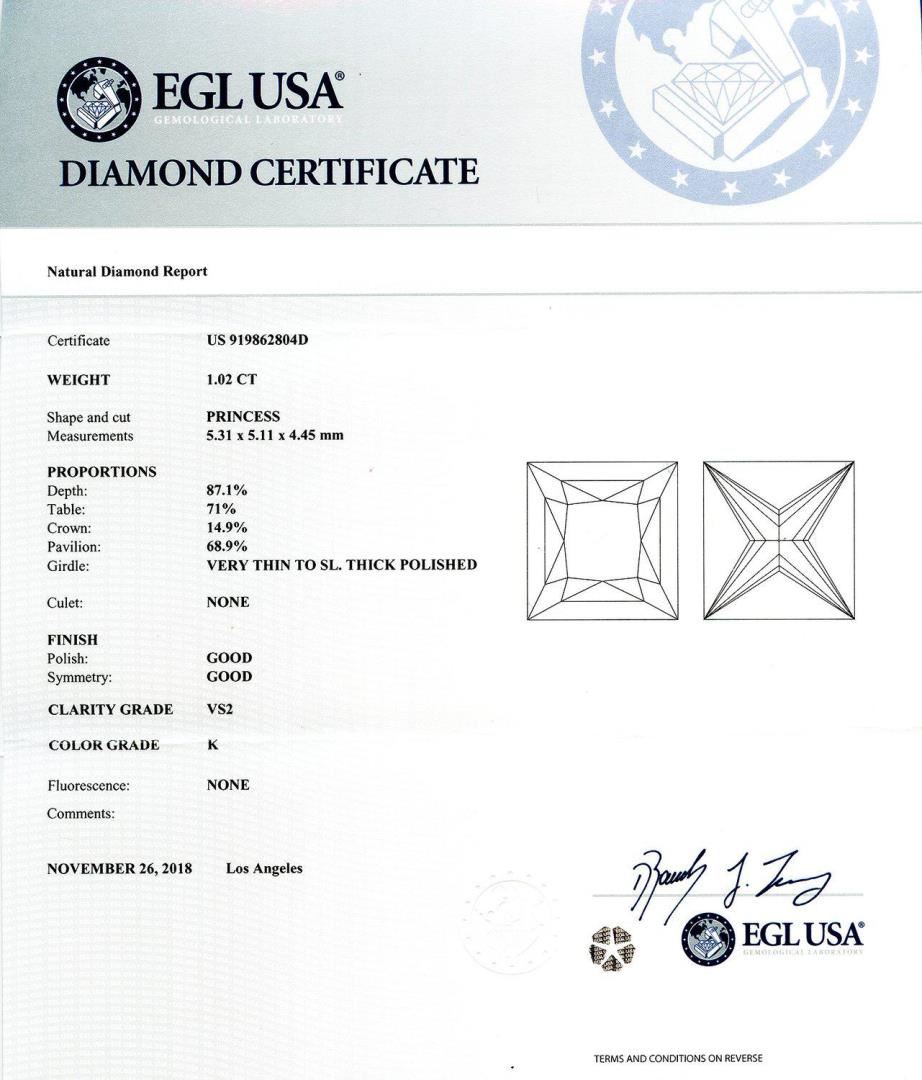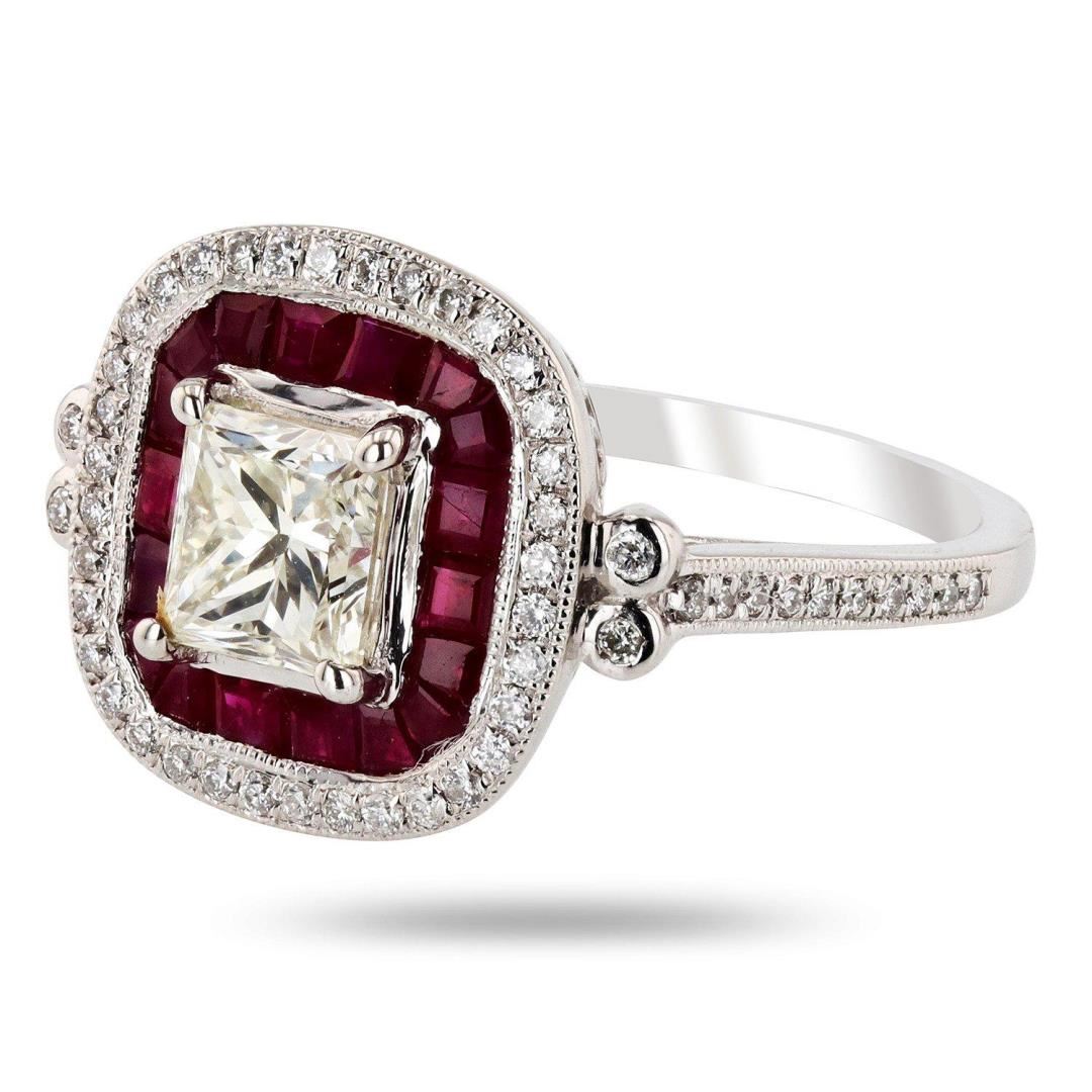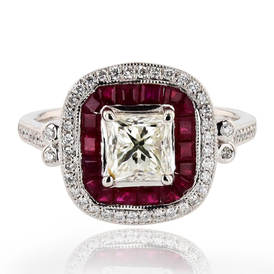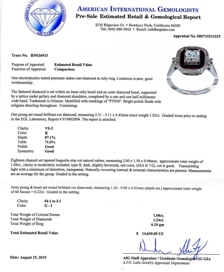 One electronically tested platinum ladies cast diamond and ruby ring. Condition is new, good workmanship. The featured diamond is set within an inner ruby bezel and an outer diamond bezel, supported by a lattice under gallery and diamond shoulders, completed by a one and one half millimeter wide band. Trademark is Orianne. Identified with markings of "PT950". Bright polish finish with milgrain detailing throughout. Containing: One prong set round brilliant cut diamond, measuring 5.31mm to 5.11mm x 4.45mm exact weight 1.02ct. Graded loose prior to setting in the EGL Laboratory, Report # 919862804. The report is attached. Clarity VS2 Color K Depth 87.1% Table 71.0% Polish Good Symmetry Good Eighteen channel set tapered baguette step cut natural rubies, measuring 2.00mm x 1.50mm x 0.96mm, approximate total weight of 1.08ct., clarity is moderately included, type II, dark, slightly brownish, red color, (GIA R 7/2), cut is good. Transmitting light with a minimum of distortion, transparent. Naturally occurring internal and external characteristics are present. Measurements are an average for the group. Graded in the setting. Sixty prong and bezel set round brilliant cut diamonds, measuring 1.20mm to 0.90mm x 0.63mm (depth est.) approximate total weight of 60 Stones = 0.22ct. Graded in the setting. Clarity SI1 to I1 Color G - I Total Weight of Colored Stones 1.08ct. Total Weight of Diamonds 1.24ct. Total Weight of Ring 6.10 gm #LREF-6999