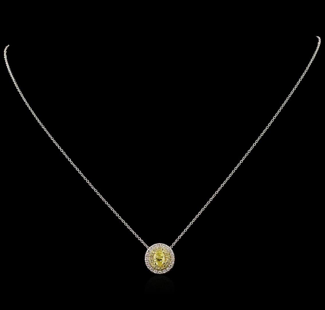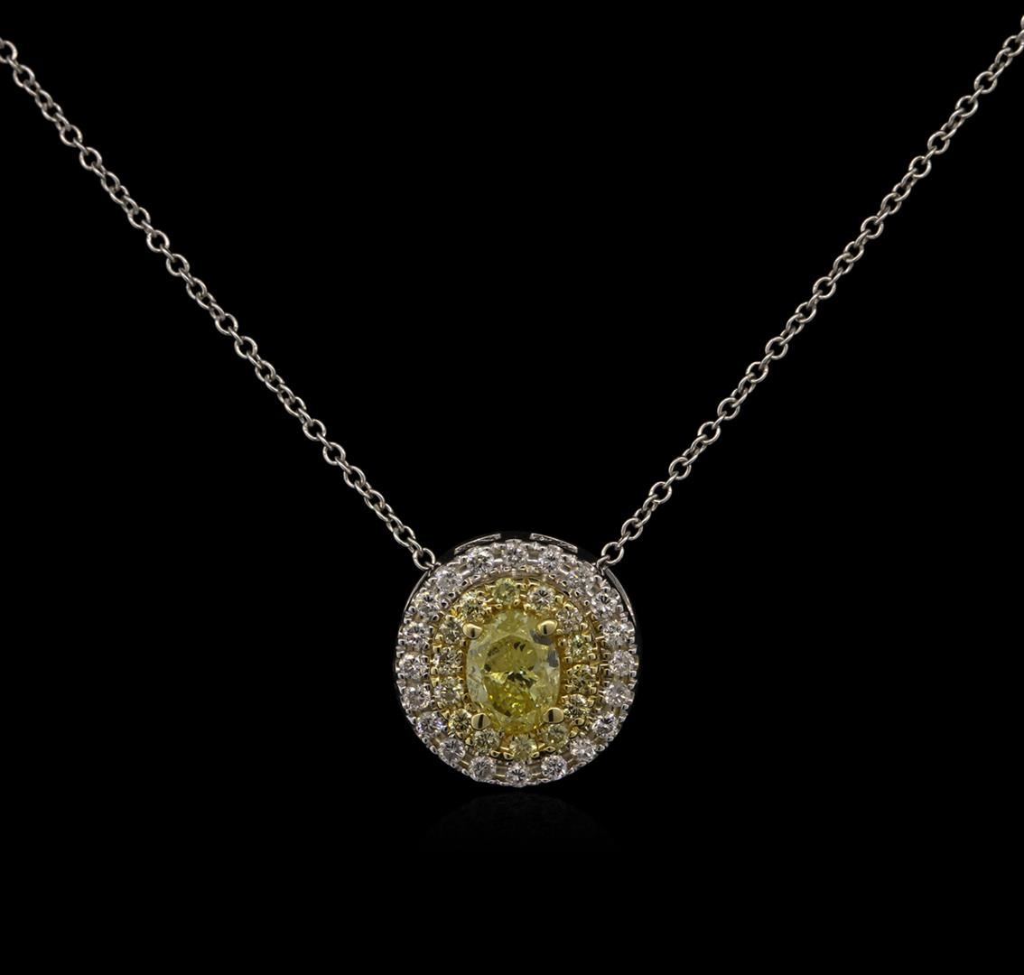 One pendant with chain featuring: 14KT white and yellow gold weighing 3.30 grams containing one prong set oval shape yellow diamond center stone with a total weight of 0.68ct and pave set round white diamonds with a total weight of 0.34ct.