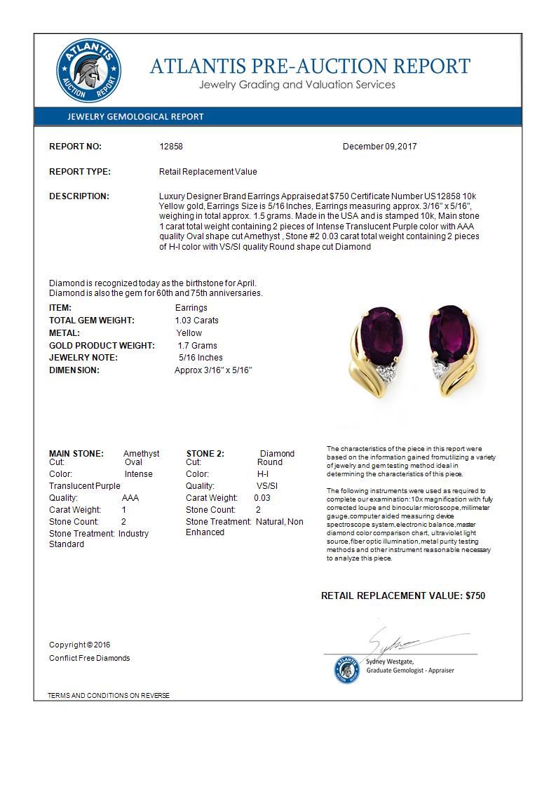 REF-11K3W -12858 ---- 1.03 CTW Amethyst & Diamond Earrings 10K Yellow Gold ---- Luxury Designer Brand Earrings Appraised at $750 Certificate Number US12858 10k Yellow gold, Earrings Size is 5/16 Inches, Earrings measuring approx. 3/16" x 5/16", weighing in total approx. 1.5 grams. Made in the USA and is stamped 10k, Main stone 1 carat total weight containing 2 pieces of Intense Translucent Purple color with AAA quality Oval shape cut Amethyst , Stone #2 0.03 carat total weight containing 2 pieces of H-I color with VS/SI quality Round shape cut Diamond