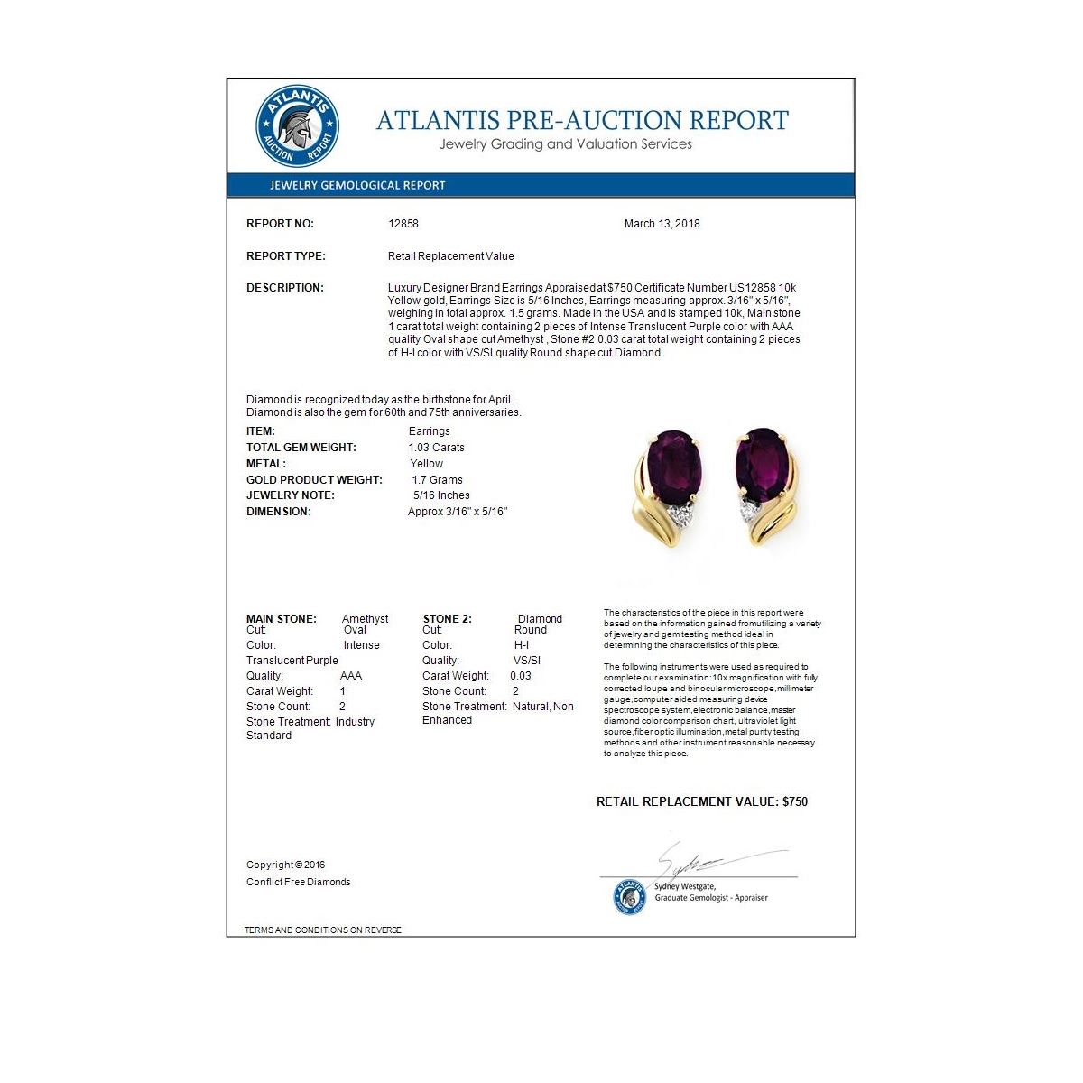 REF-11K3W -12858 ---- 1.03 CTW Amethyst & Diamond Earrings 10K Yellow Gold ---- Luxury Designer Brand Earrings Appraised at $750 Certificate Number US12858 10k Yellow gold, Earrings Size is 5/16 Inches, Earrings measuring approx. 3/16" x 5/16", weighing in total approx. 1.5 grams. Made in the USA and is stamped 10k, Main stone 1 carat total weight containing 2 pieces of Intense Translucent Purple color with AAA quality Oval shape cut Amethyst , Stone #2 0.03 carat total weight containing 2 pieces of H-I color with VS/SI quality Round shape cut Diamond