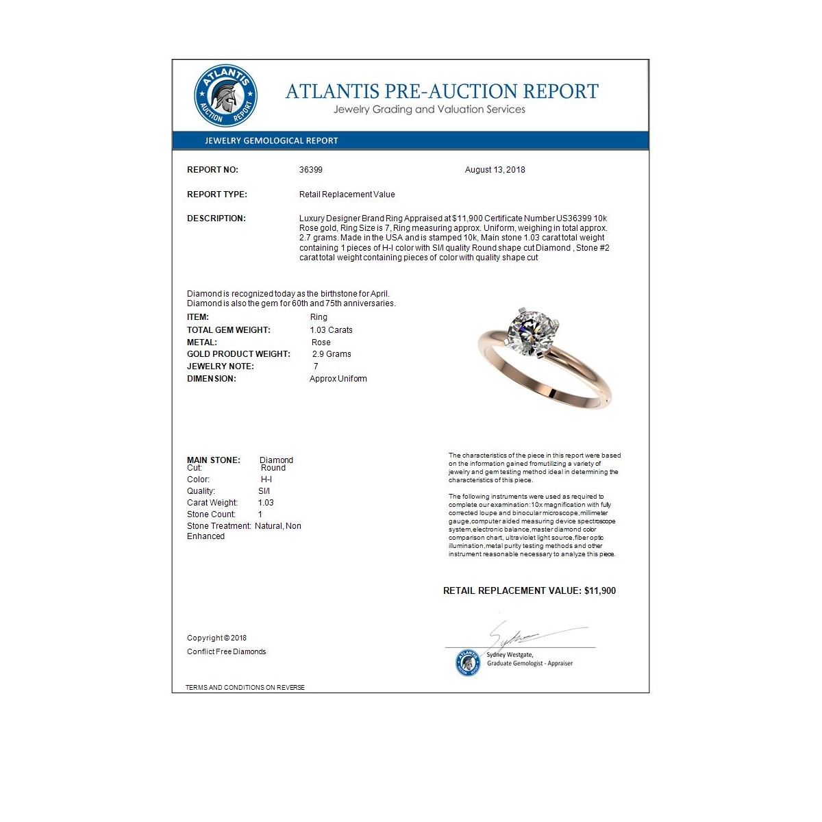 REF-216X4T -36399 ---- 1.03 CTW Certified H-SI/I Quality Diamond Solitaire Engagement Ring 10K Rose Gold ---- Luxury Designer Brand Ring Appraised at $11,900 Certificate Number US36399 10k Rose gold, Ring Size is 7, Ring measuring approx. Uniform, weighing in total approx. 2.7 grams. Made in the USA and is stamped 10k, Main stone 1.03 carat total weight containing 1 pieces of H-I color with SI/I quality Round shape cut Diamond , Stone #2 carat total weight containing pieces of color with quality shape cut
