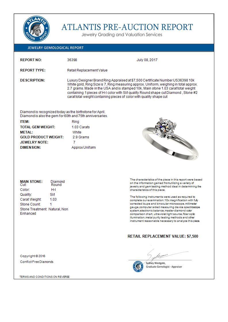 1.03 CTW Certified H-SI/I Quality Diamond Solitaire Engagement Ring 10K White Gold ---- Luxury Designer Brand Ring Appraised Retail Price at $7,500 ---- SKU Number US36398 10k White gold Ring Size is 7, Ring measuring approx. Uniform, weighing in total approx. 2.7 grams. Made in the USA and is stamped 10k, Main stone 1.03 carat total weight containing 1 pieces of H-I color with SI/I quality Round shape cut Diamond , Stone #2 carat total weight containing pieces of color with quality shape cut