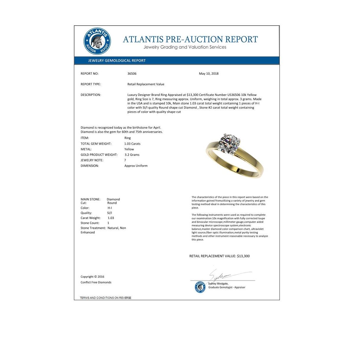 REF-199H5A -36506 ---- 1.03 CTW Certified H-SI/I Quality Diamond Solitaire Engagement Ring 10K Yellow Gold ---- Luxury Designer Brand Ring Appraised at $13,300 Certificate Number US36506 10k Yellow gold, Ring Size is 7, Ring measuring approx. Uniform, weighing in total approx. 3 grams. Made in the USA and is stamped 10k, Main stone 1.03 carat total weight containing 1 pieces of H-I color with SI/I quality Round shape cut Diamond , Stone #2 carat total weight containing pieces of color with quality shape cut