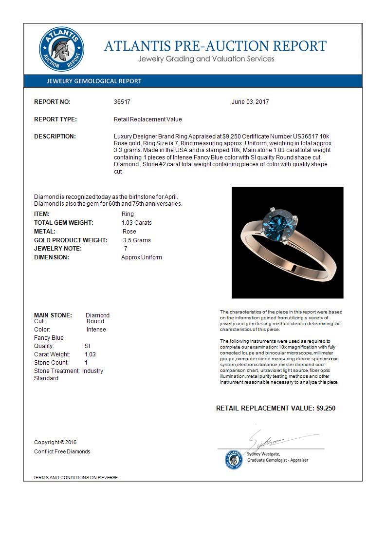 1.03 CTW Certified Intense Blue SI Diamond Solitaire Engagement Ring 10K Rose Gold ---- Luxury Designer Brand Ring Appraised Retail Price at $9,250 ---- SKU Number US36517 10k Rose gold Ring Size is 7, Ring measuring approx. Uniform, weighing in total approx. 3.3 grams. Made in the USA and is stamped 10k, Main stone 1.03 carat total weight containing 1 pieces of Intense Fancy Blue color with SI quality Round shape cut Diamond , Stone #2 carat total weight containing pieces of color with quality shape cut