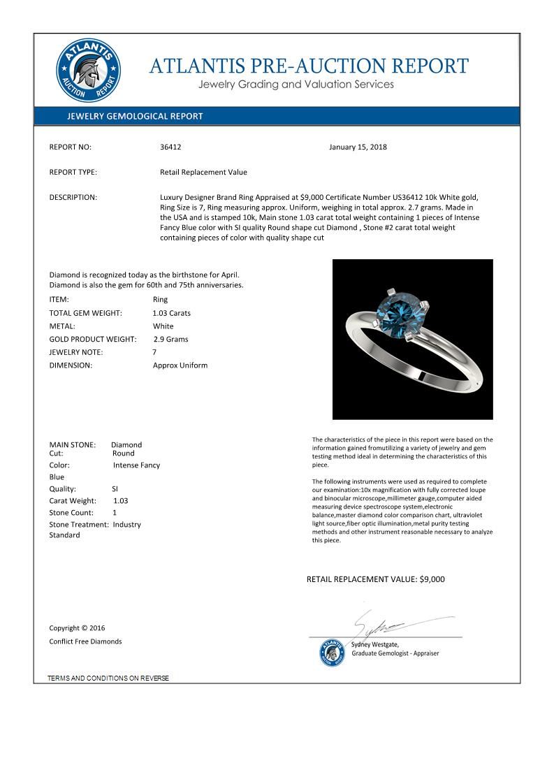 REF-136K4W -36412 ---- 1.03 CTW Certified Intense Blue SI Diamond Solitaire Engagement Ring 10K White Gold ---- Luxury Designer Brand Ring Appraised at $9,000 Certificate Number US36412 10k White gold, Ring Size is 7, Ring measuring approx. Uniform, weighing in total approx. 2.7 grams. Made in the USA and is stamped 10k, Main stone 1.03 carat total weight containing 1 pieces of Intense Fancy Blue color with SI quality Round shape cut Diamond , Stone #2 carat total weight containing pieces of color with quality shape cut