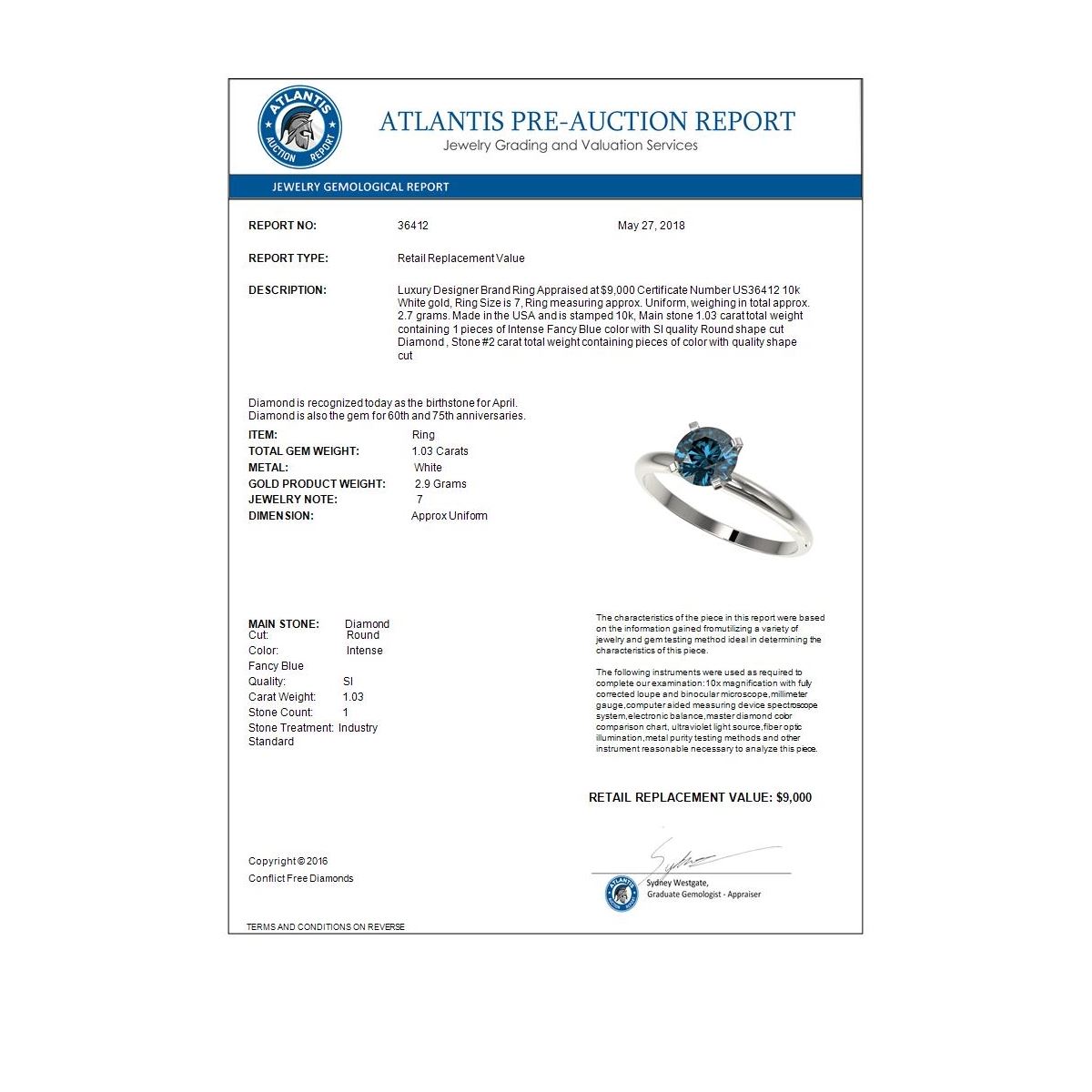 REF-136W4F -36412 ---- 1.03 CTW Certified Intense Blue SI Diamond Solitaire Engagement Ring 10K White Gold ---- Luxury Designer Brand Ring Appraised at $9,000 Certificate Number US36412 10k White gold, Ring Size is 7, Ring measuring approx. Uniform, weighing in total approx. 2.7 grams. Made in the USA and is stamped 10k, Main stone 1.03 carat total weight containing 1 pieces of Intense Fancy Blue color with SI quality Round shape cut Diamond , Stone #2 carat total weight containing pieces of color with quality shape cut