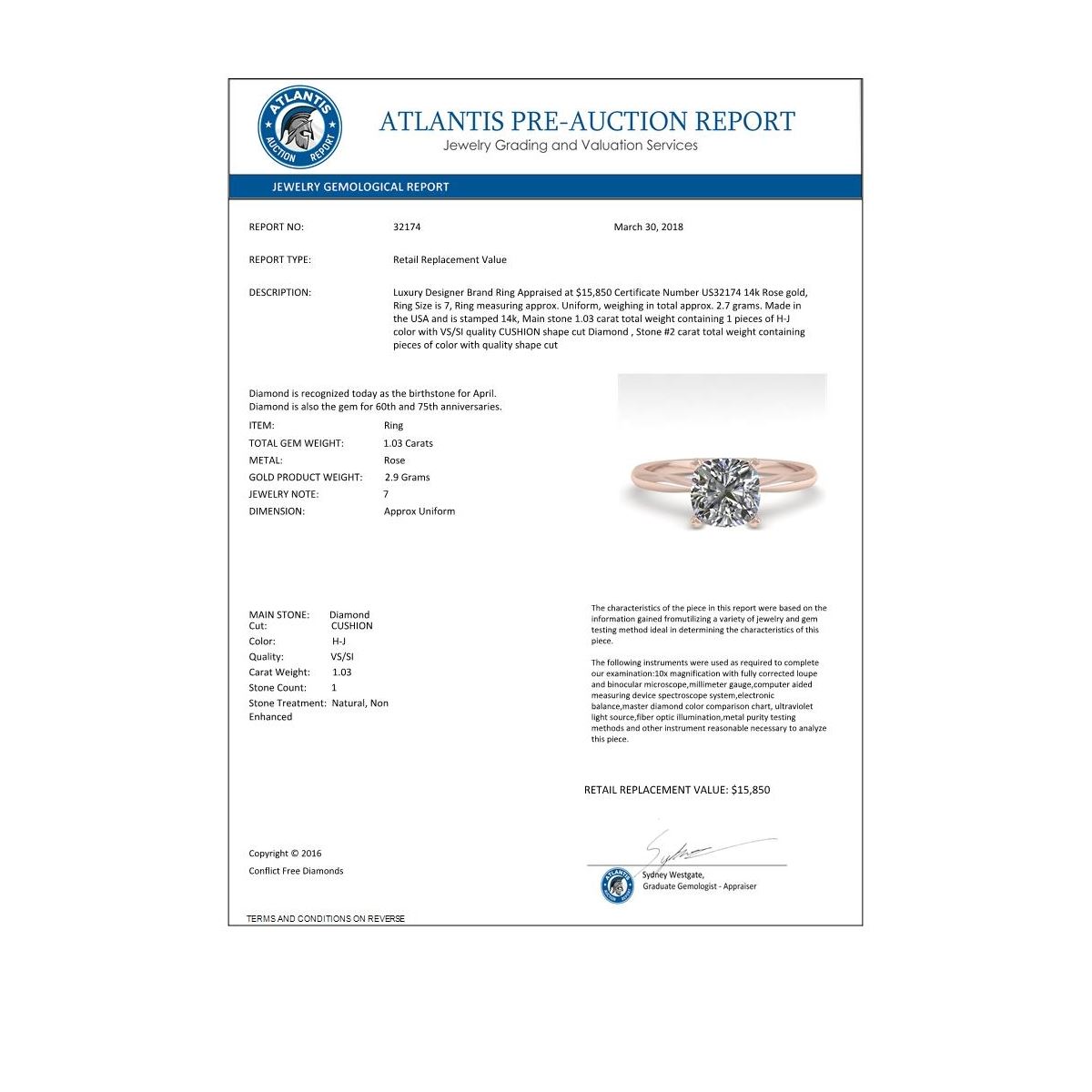 REF-297A2X -32174 ---- 1.03 CTW Cushion Cut VS/SI Diamond Engagement Designer Ring 14K Rose Gold ---- Luxury Designer Brand Ring Appraised at $15,850 Certificate Number US32174 14k Rose gold, Ring Size is 7, Ring measuring approx. Uniform, weighing in total approx. 2.7 grams. Made in the USA and is stamped 14k, Main stone 1.03 carat total weight containing 1 pieces of H-J color with VS/SI quality CUSHION shape cut Diamond , Stone #2 carat total weight containing pieces of color with quality shape cut