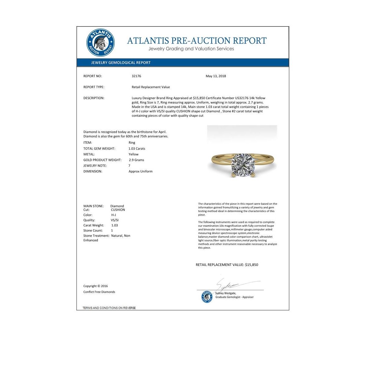 REF-297K2W -32176 ---- 1.03 CTW Cushion Cut VS/SI Diamond Engagement Designer Ring 14K Yellow Gold ---- Luxury Designer Brand Ring Appraised at $15,850 Certificate Number US32176 14k Yellow gold, Ring Size is 7, Ring measuring approx. Uniform, weighing in total approx. 2.7 grams. Made in the USA and is stamped 14k, Main stone 1.03 carat total weight containing 1 pieces of H-J color with VS/SI quality CUSHION shape cut Diamond , Stone #2 carat total weight containing pieces of color with quality shape cut