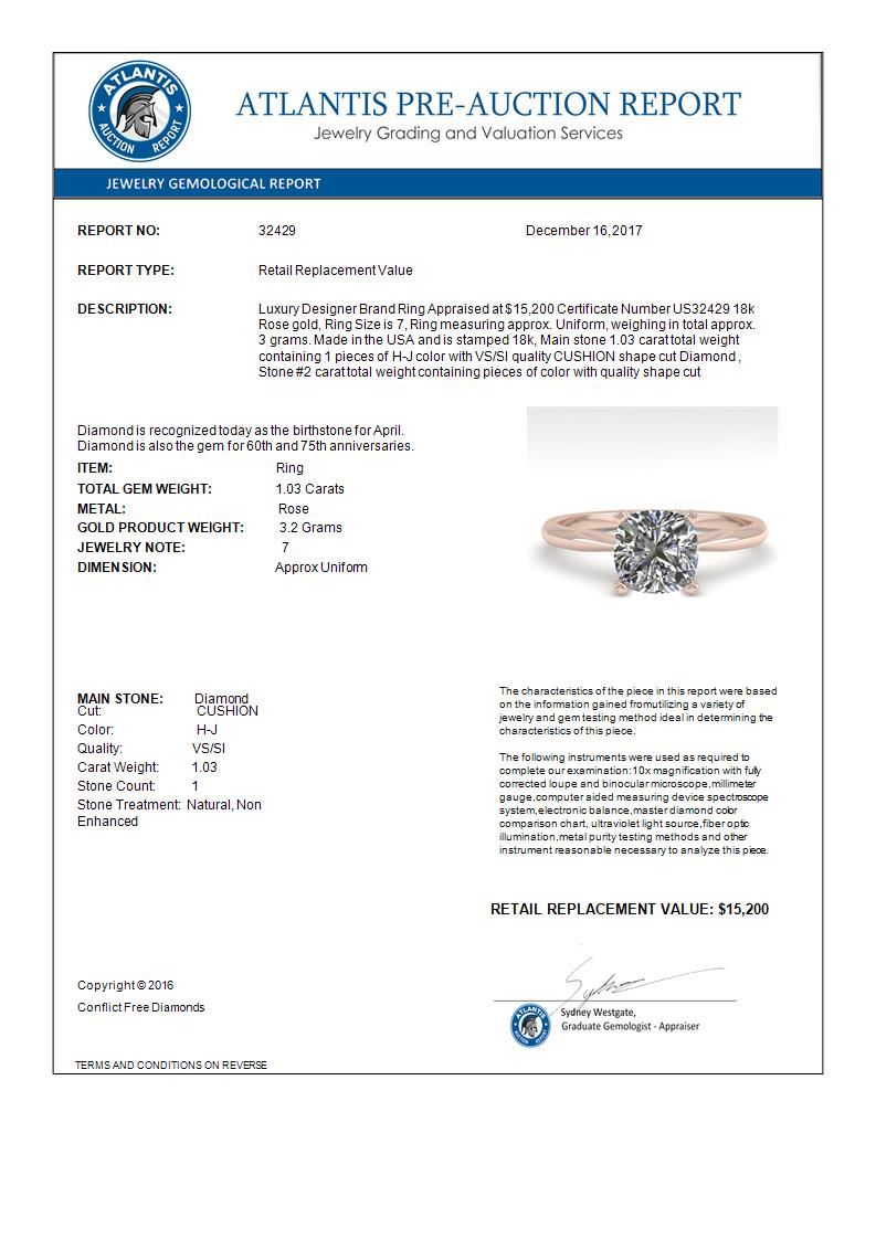 REF-285A2X -32429 ---- 1.03 CTW Cushion Cut VS/SI Diamond Engagement Designer Ring 18K Rose Gold ---- Luxury Designer Brand Ring Appraised at $15,200 Certificate Number US32429 18k Rose gold, Ring Size is 7, Ring measuring approx. Uniform, weighing in total approx. 3 grams. Made in the USA and is stamped 18k, Main stone 1.03 carat total weight containing 1 pieces of H-J color with VS/SI quality CUSHION shape cut Diamond , Stone #2 carat total weight containing pieces of color with quality shape cut